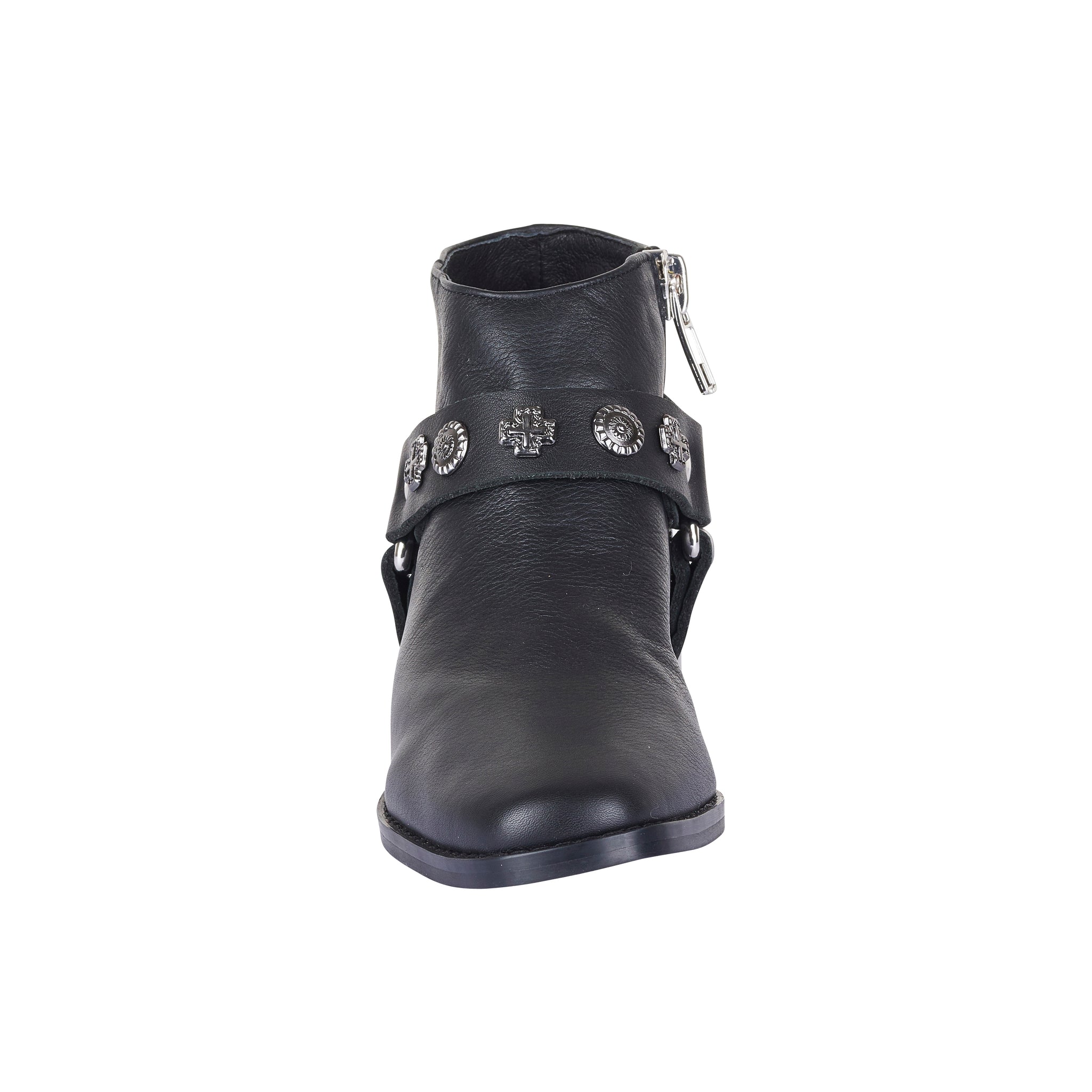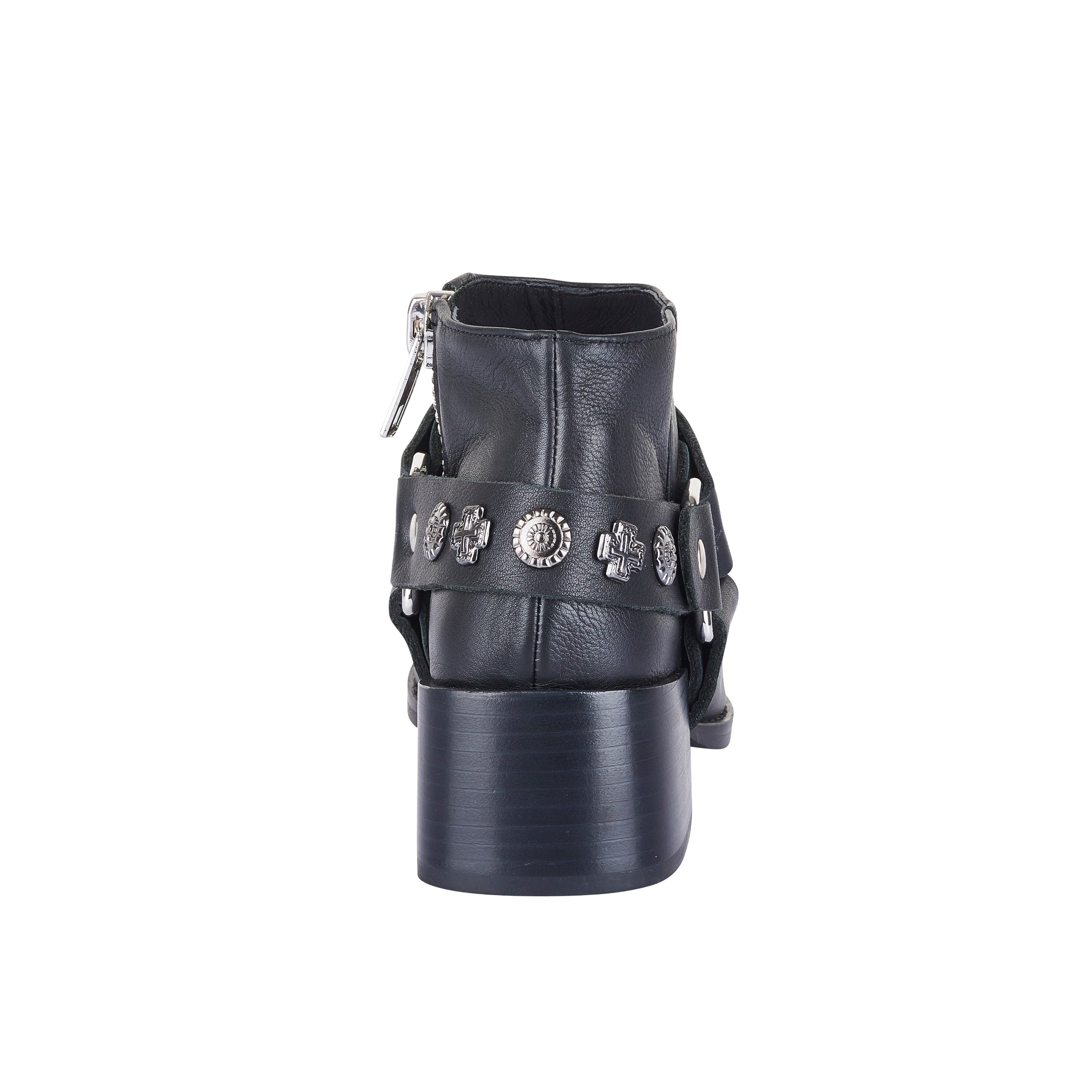 The traditional black ankle boot gets an edgy update with a silver studded removable harness. The slightly elongated round toe and chunky Chelsea heel makes this flattering shape a winter essential.