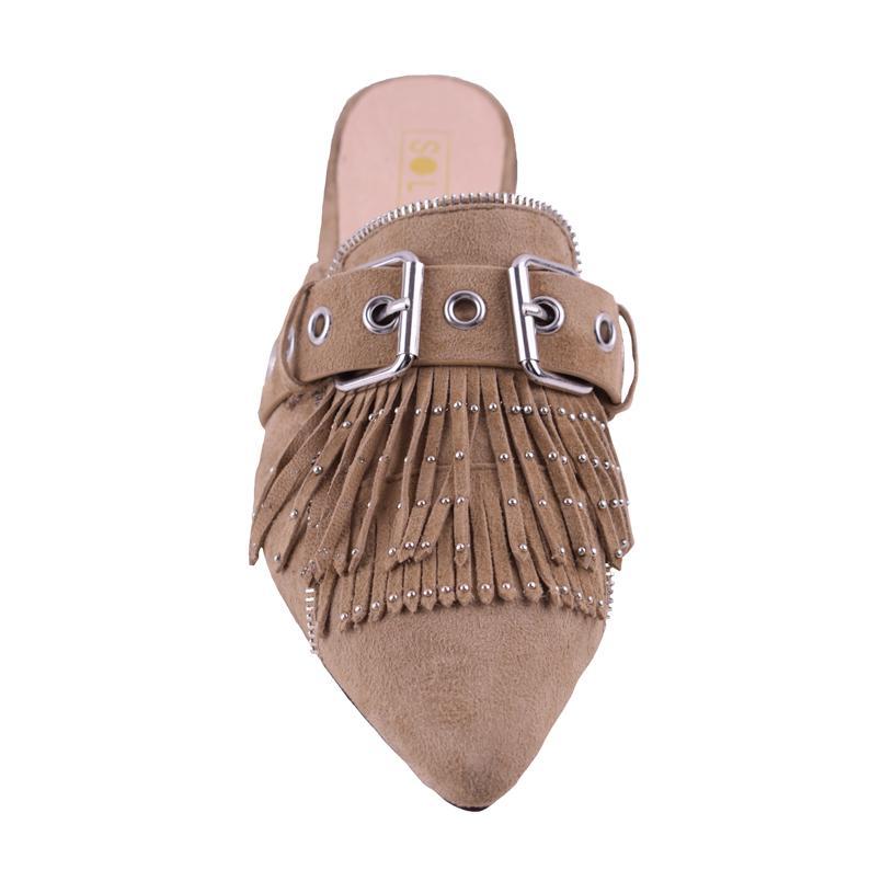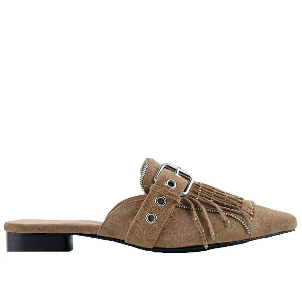 The Sadie slide takes its cues from traditional loafers to make an elevated everyday style. Delicate layered suede fringing is studded with silver hardware and falls over the front of the shoe. A statement buckle wraps the front of the foot, and is finished with bold silver rivets, statement buckles and zipper edging.