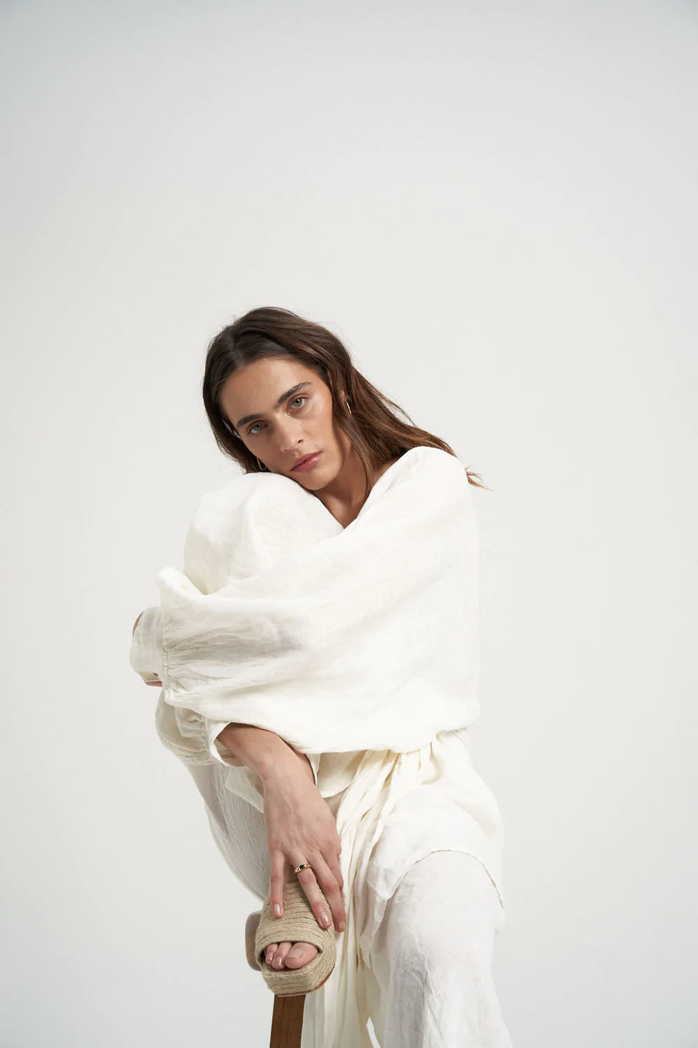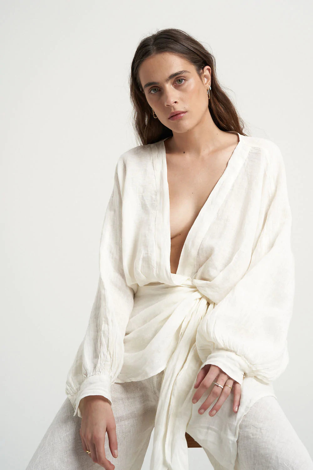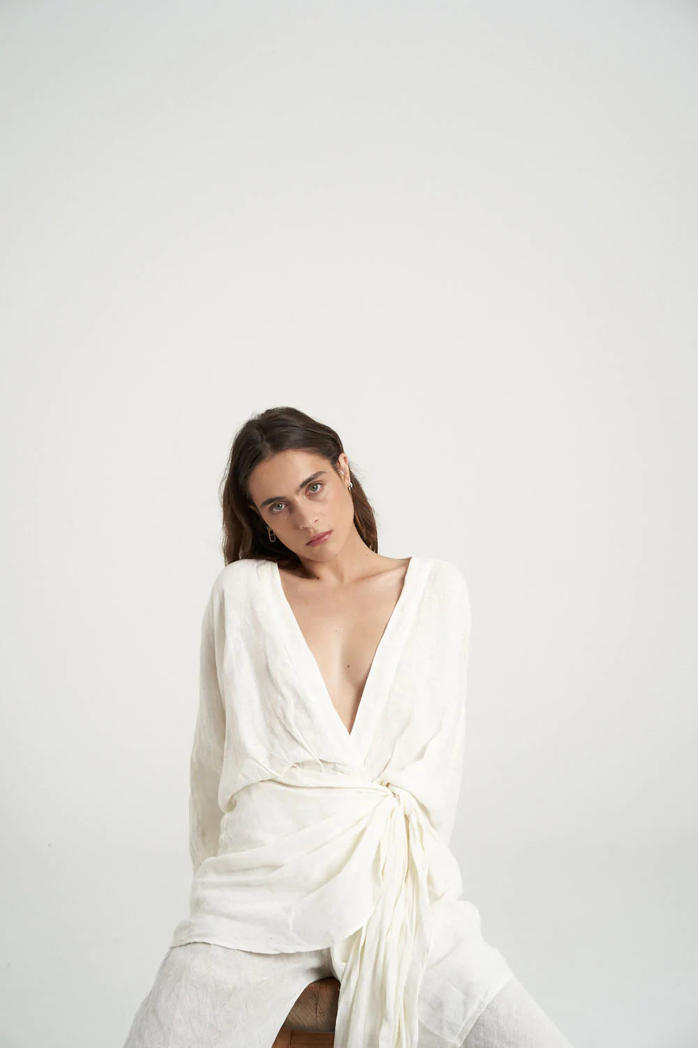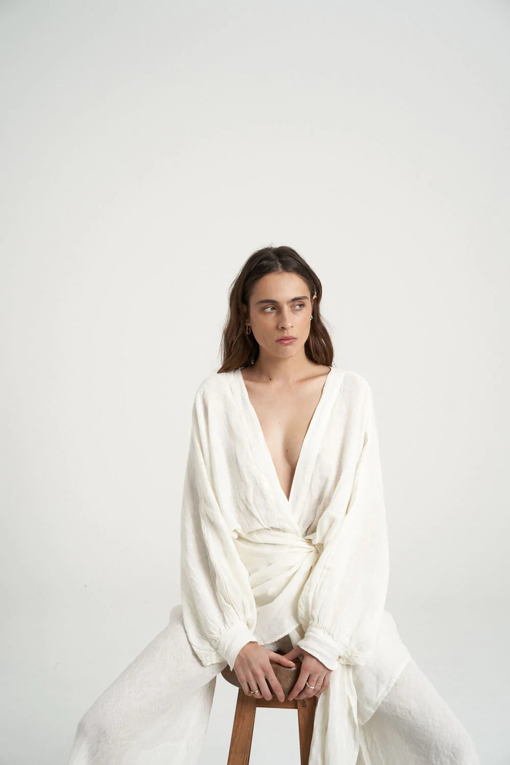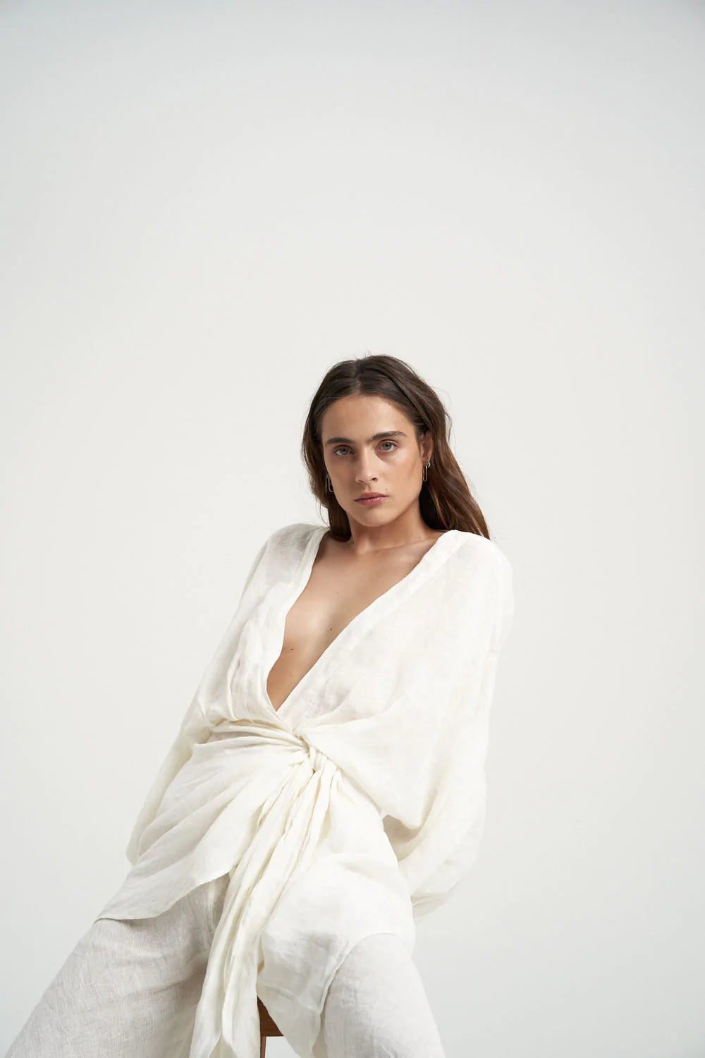 100% Linen, exclusively made in Positano for Estilo Emporio. The Ainu Dress is a wrap styled dress that can also be worn as a top over pants. It has a tie sash closure and dolman sleeves with buttoned...Read more