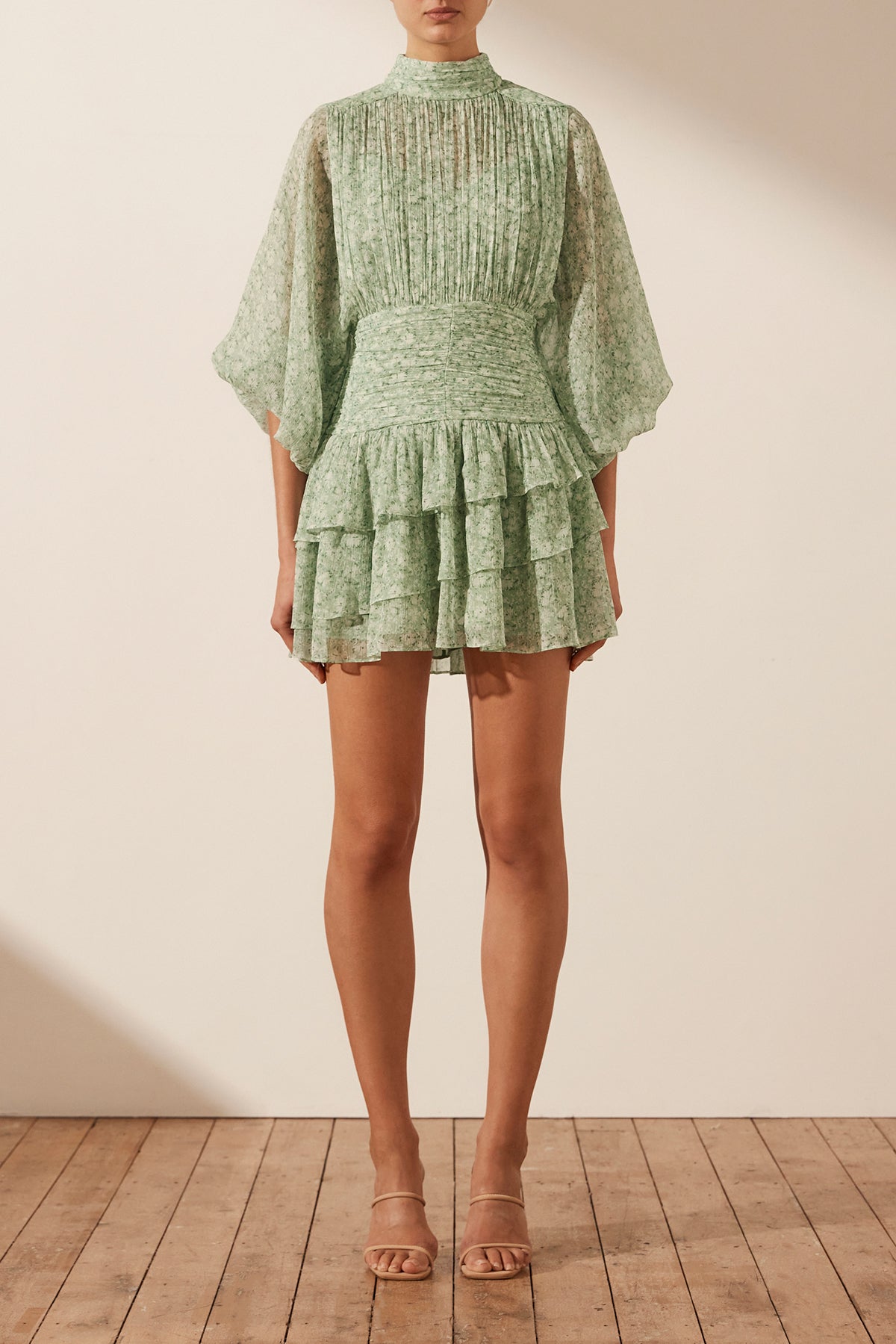 Long sleeve mini dress in a light weight semi-sheer chiffon in the exclusive Aurore print. Style number: 223011 Exclusive Aurore print Semi-sheer chiffon High neckline with back button closure Built in cami with adjustable rouleau straps Balloon sleeve...Read more