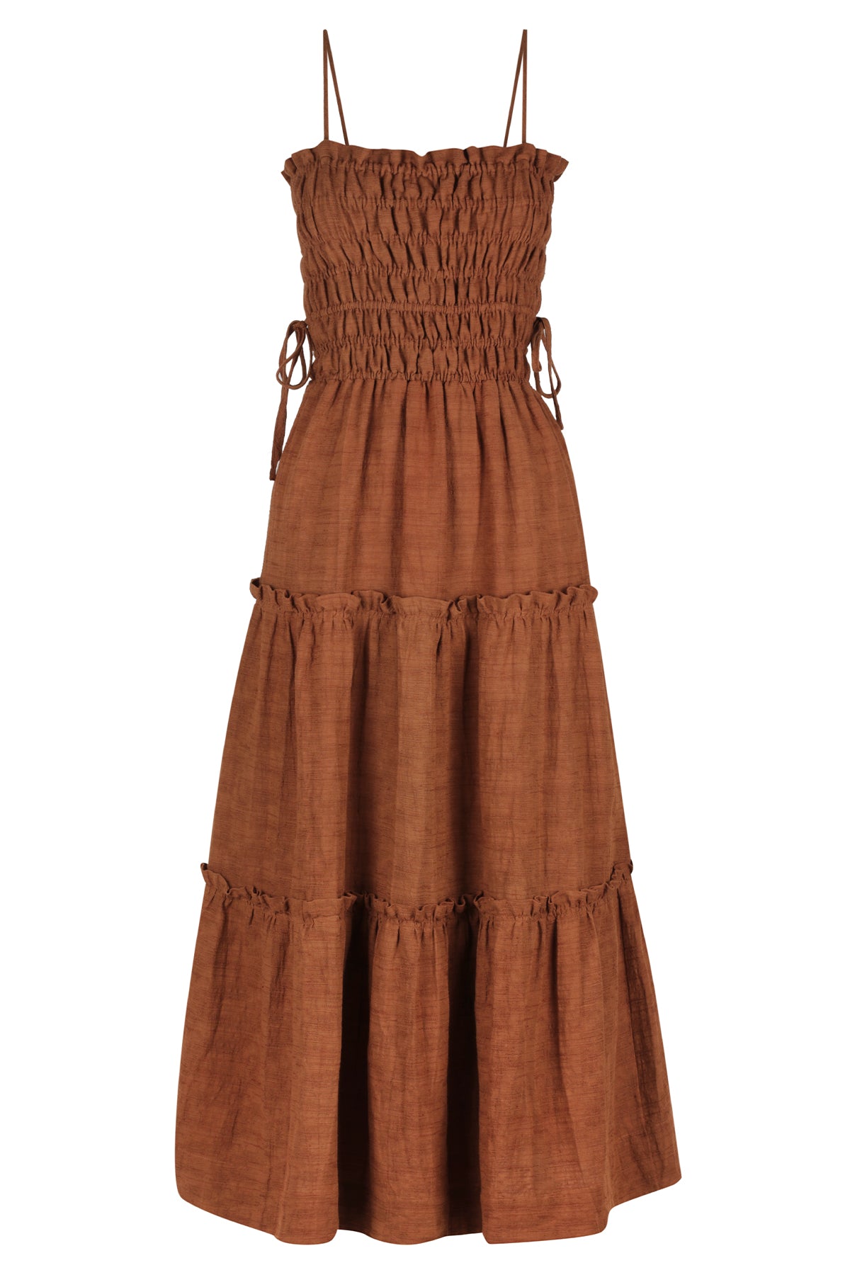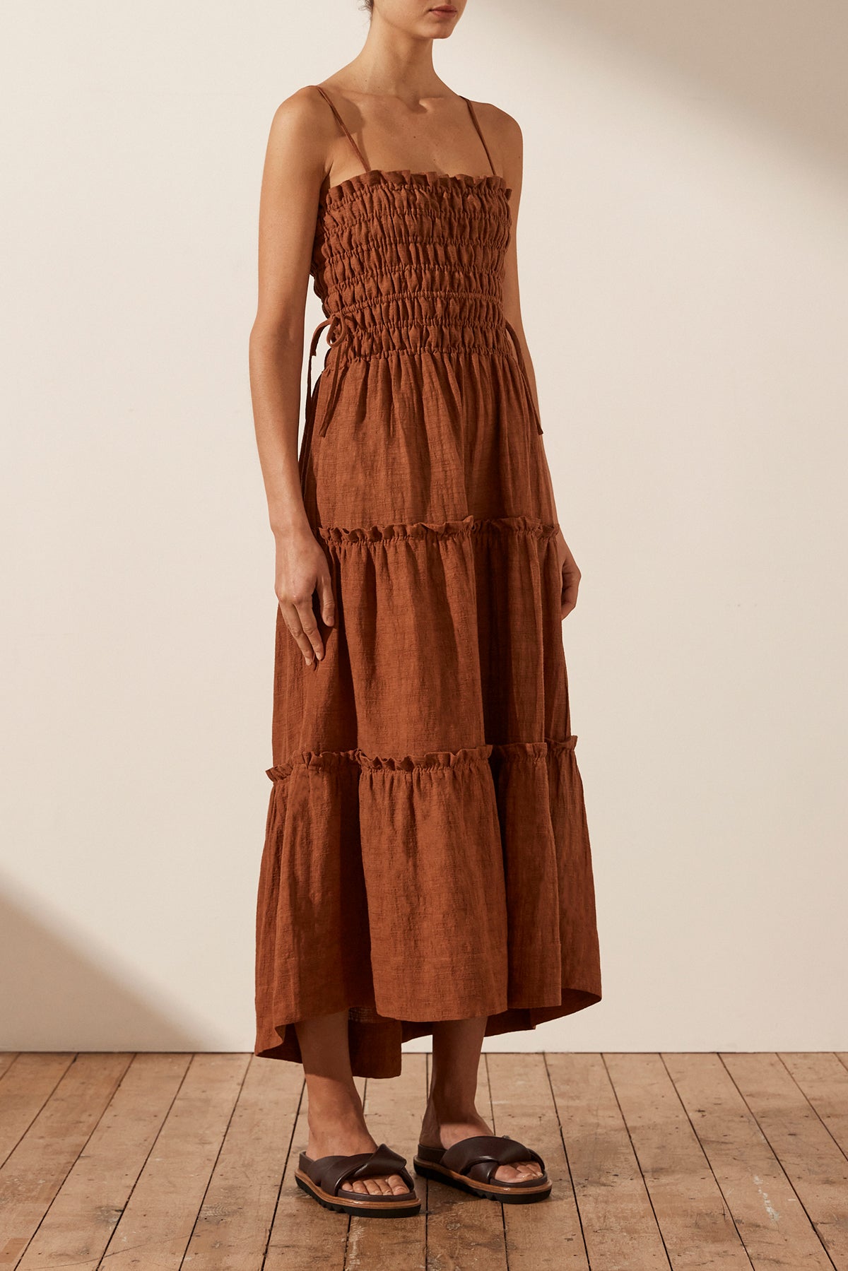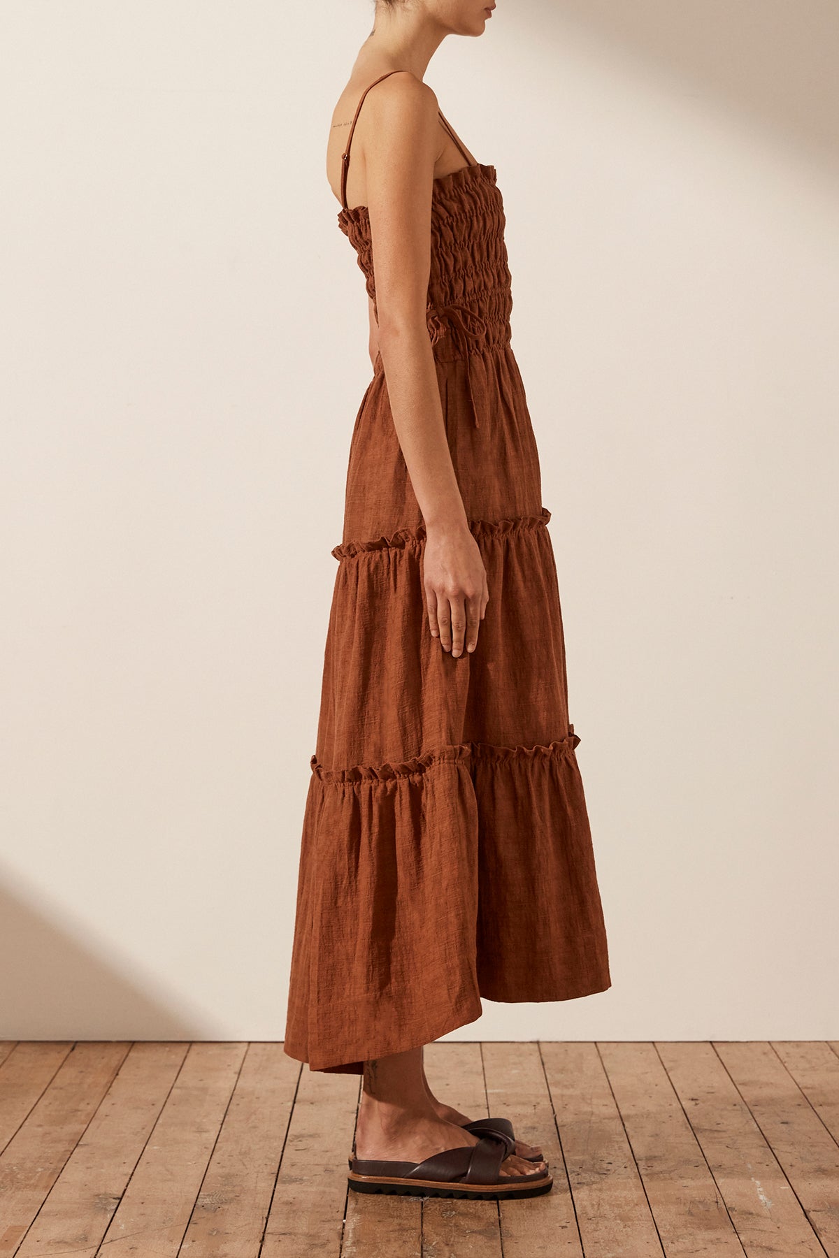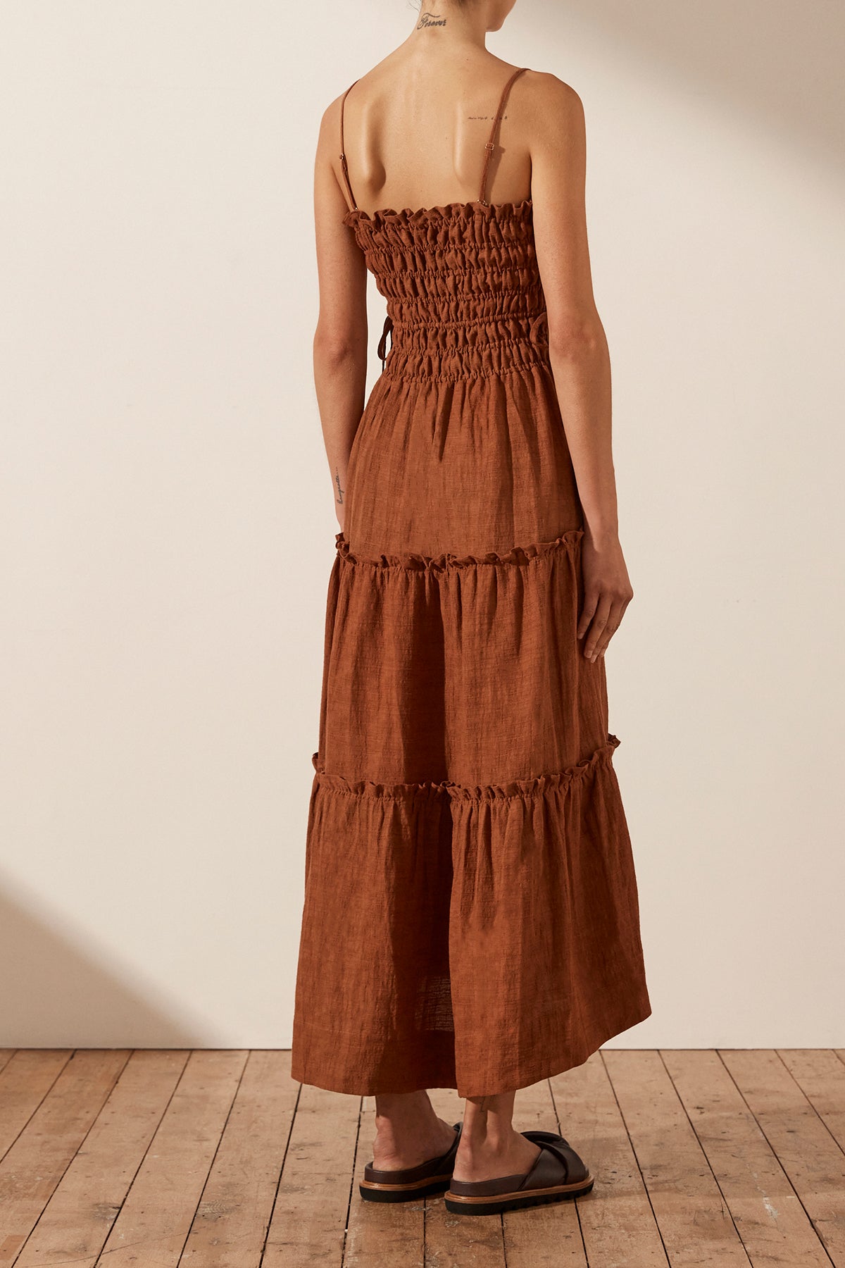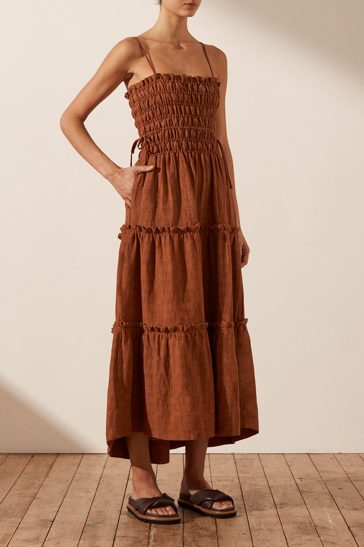 Shirred midi dress in a textured linen blend Premium linen blend fabric Adjustable rouleau straps Shirred bodice Drawstring ties at waist Side pockets Tiered midi skirt with frill detail Hi-low hemline Medium weight, non-stretchy woven 65% Cotton 35%...Read more