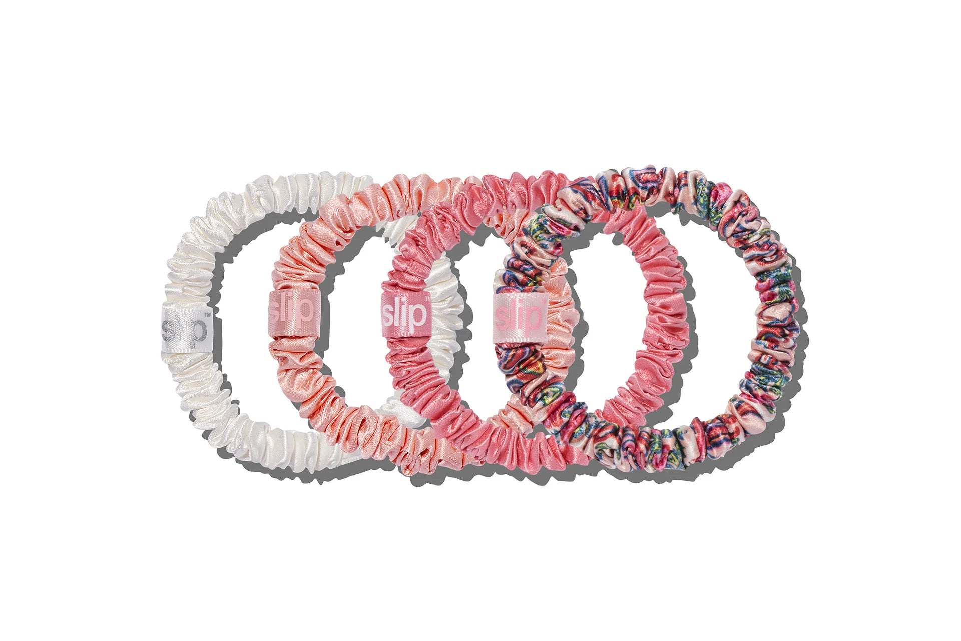 This set includes: 1 x white, 1 x rose, 1 x chelsea, 1 x blush slipsilk™ skinny scrunchies.
