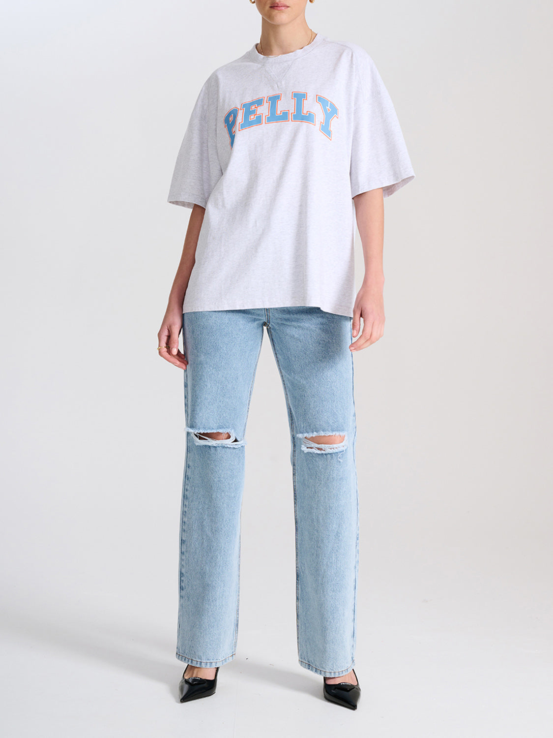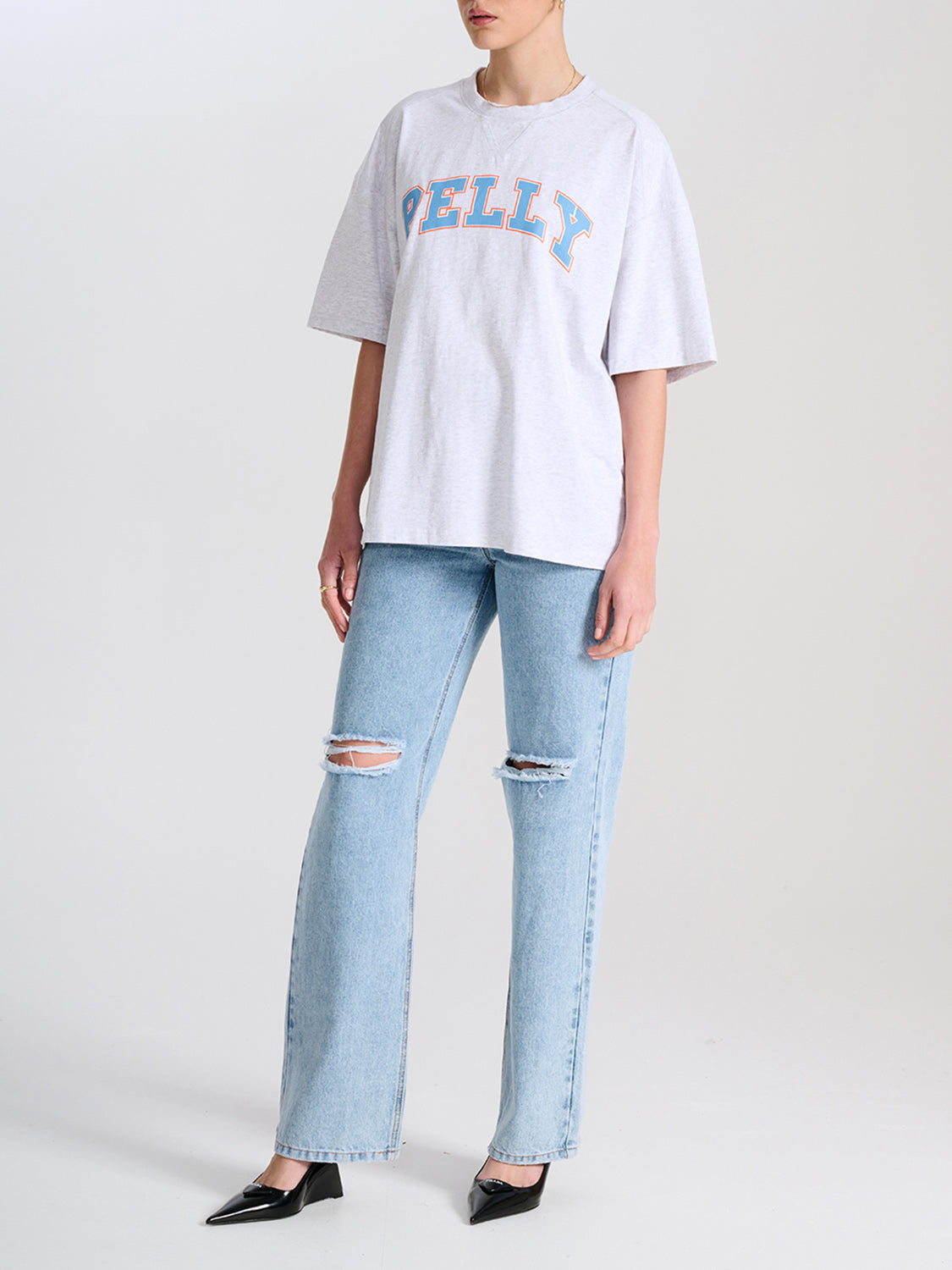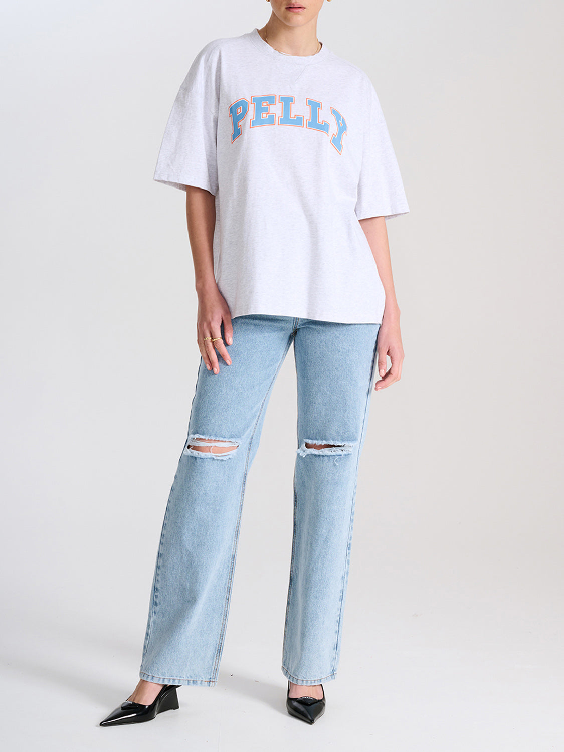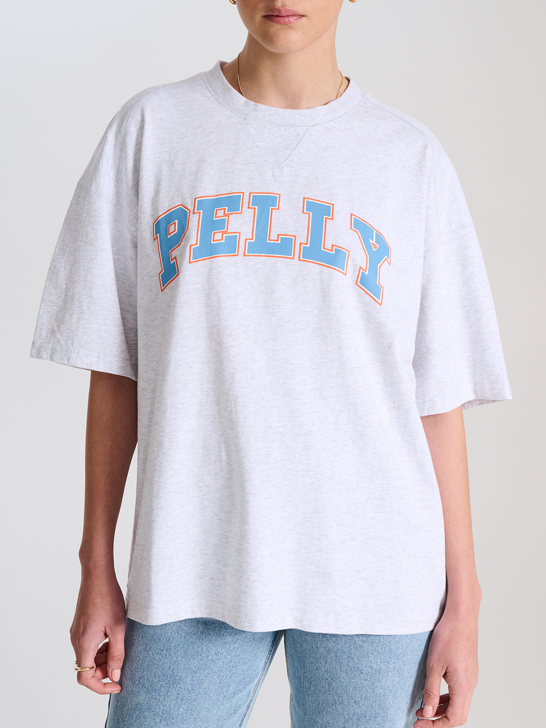 Description: Our best selling Collegiate Pelly Tee is now available in an updated colourway. Designed for an oversized fit and crafted from our recycled cotton blend jersey the tee features a branded collegiate style print, designed in house.
