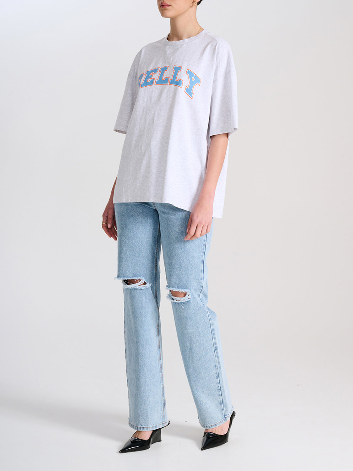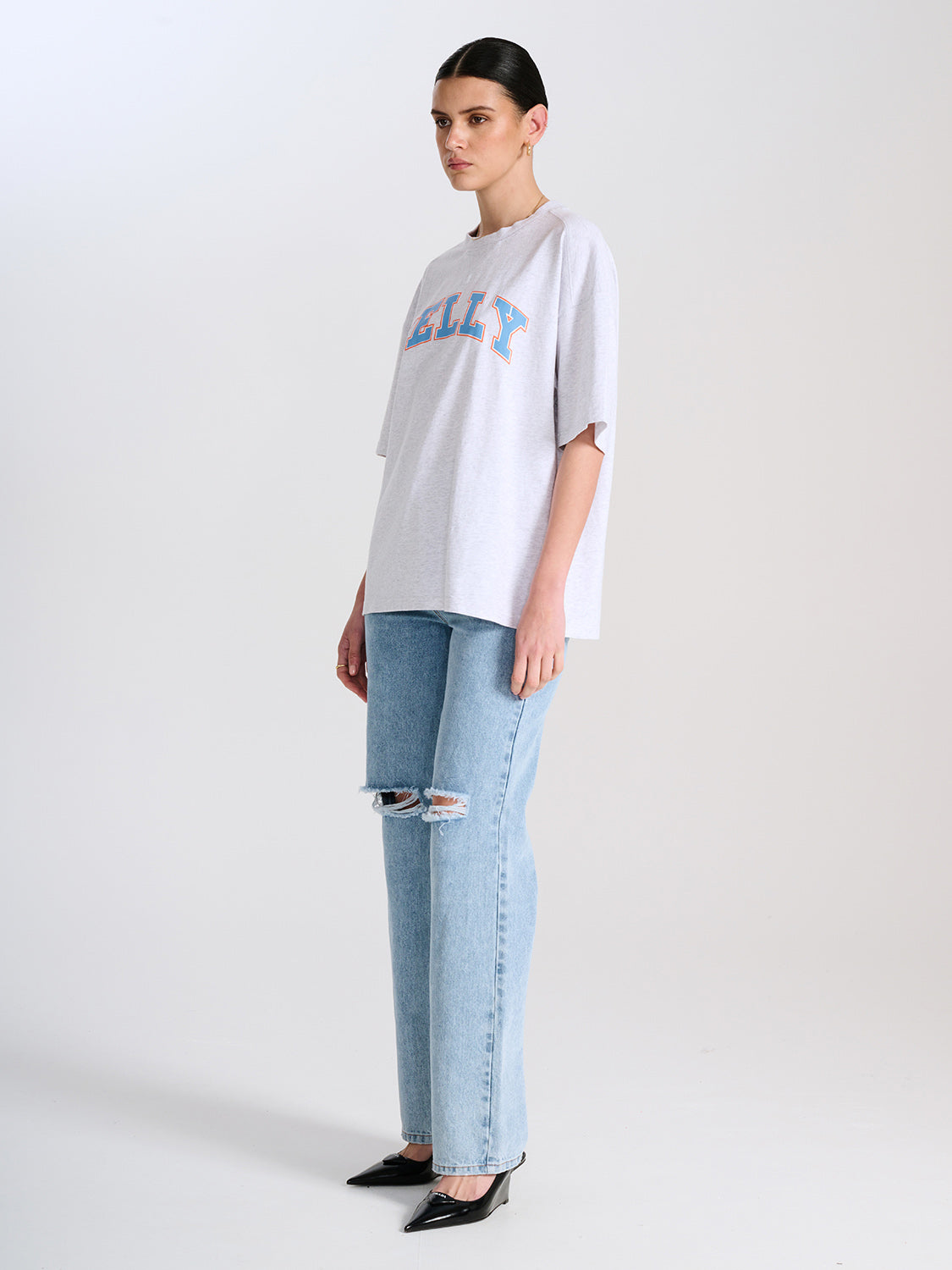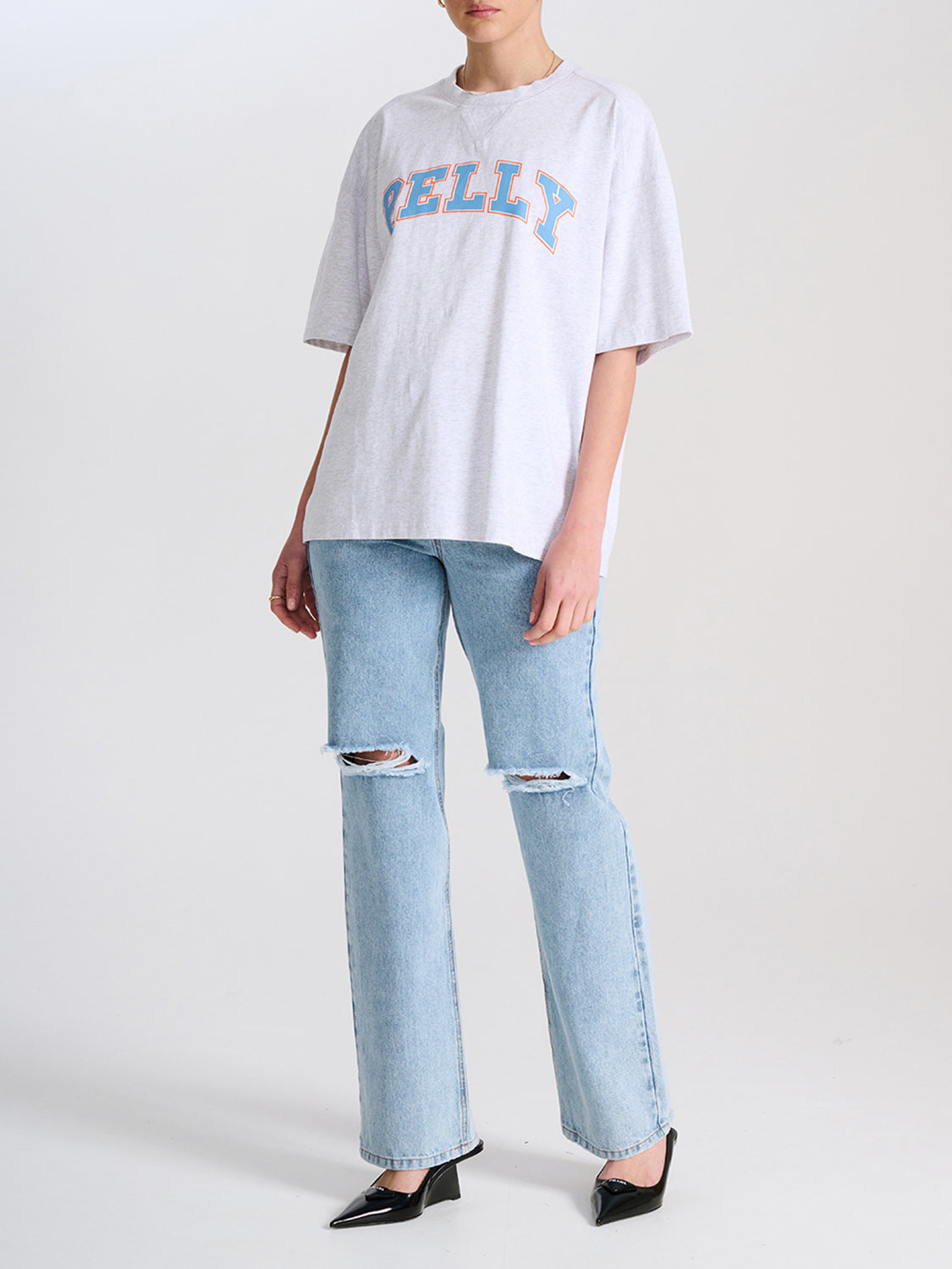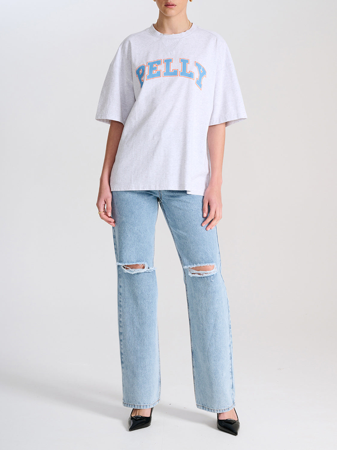 Description: Our best selling Collegiate Pelly Tee is now available in an updated colourway. Designed for an oversized fit and crafted from our recycled cotton blend jersey the tee features a branded collegiate style print, designed in house.