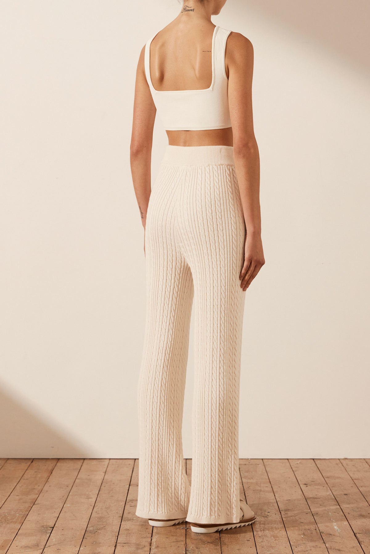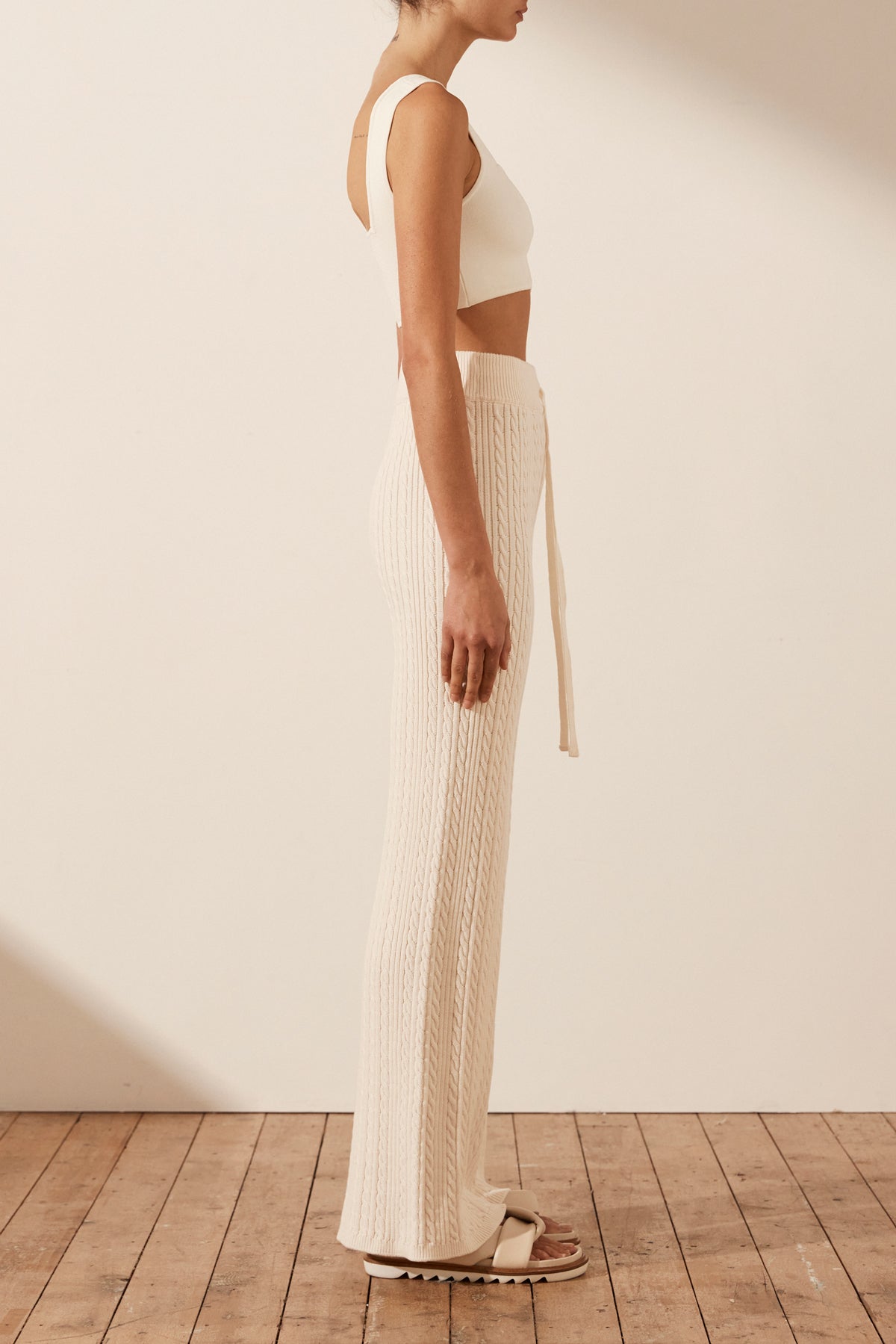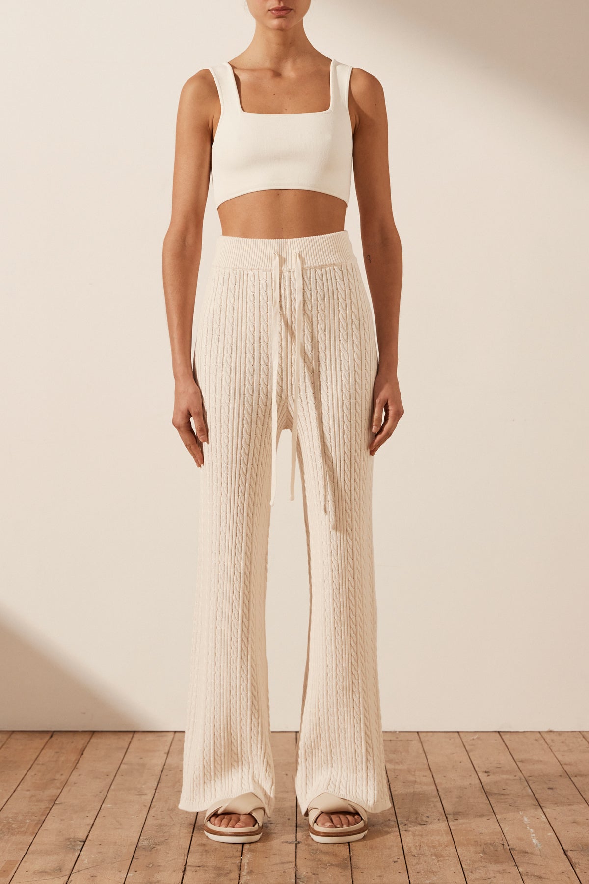 Drawstring pant in a light weight cotton cable knit.   Soft cotton knit Cable detailing High waisted Elasticated waistband with drawstring Light weight, stretchy knit 100% Cotton Designed in Australia Made in China Our studio model wears a...Read more