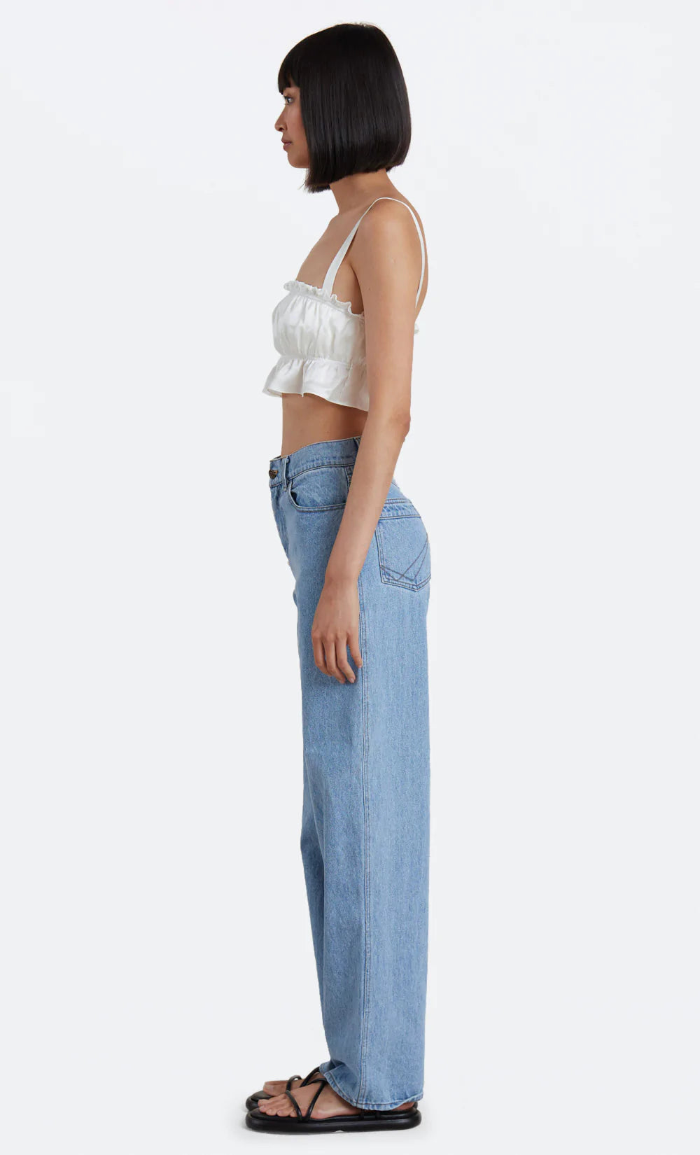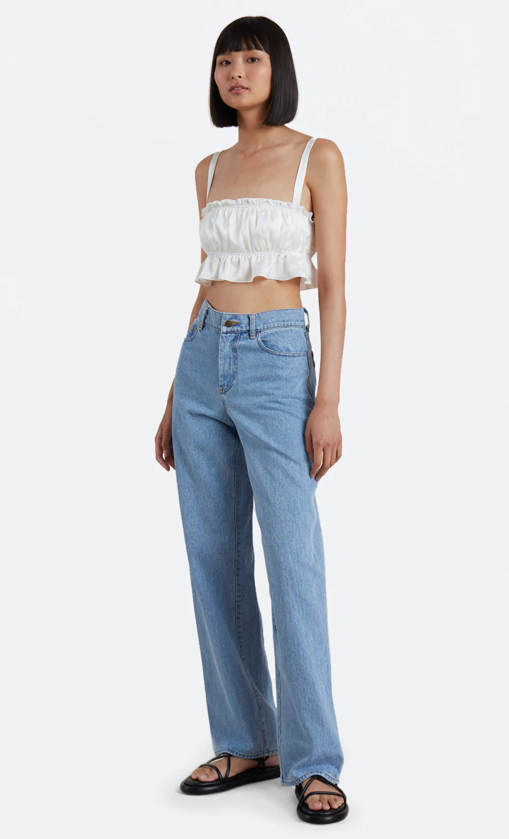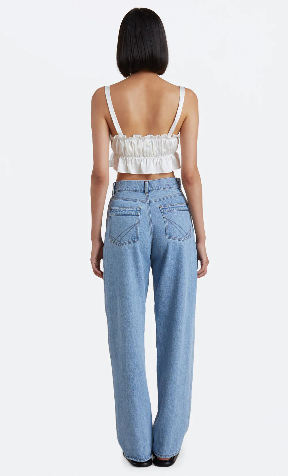 A wardrobe staple, the Gretchen Wide Leg Jean is crafted from an easy-to-wear cotton and features flat-felled seams throughout. The high-waisted jeans are finished with a back yoke, patch pockets with topstitch detail, belt loops and a coin pocket. Styled with our Amber Bodice.