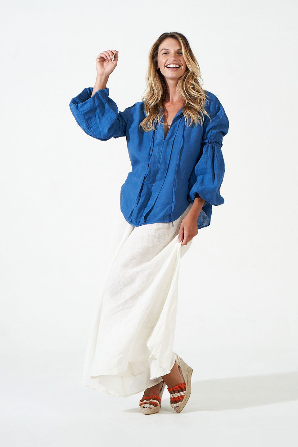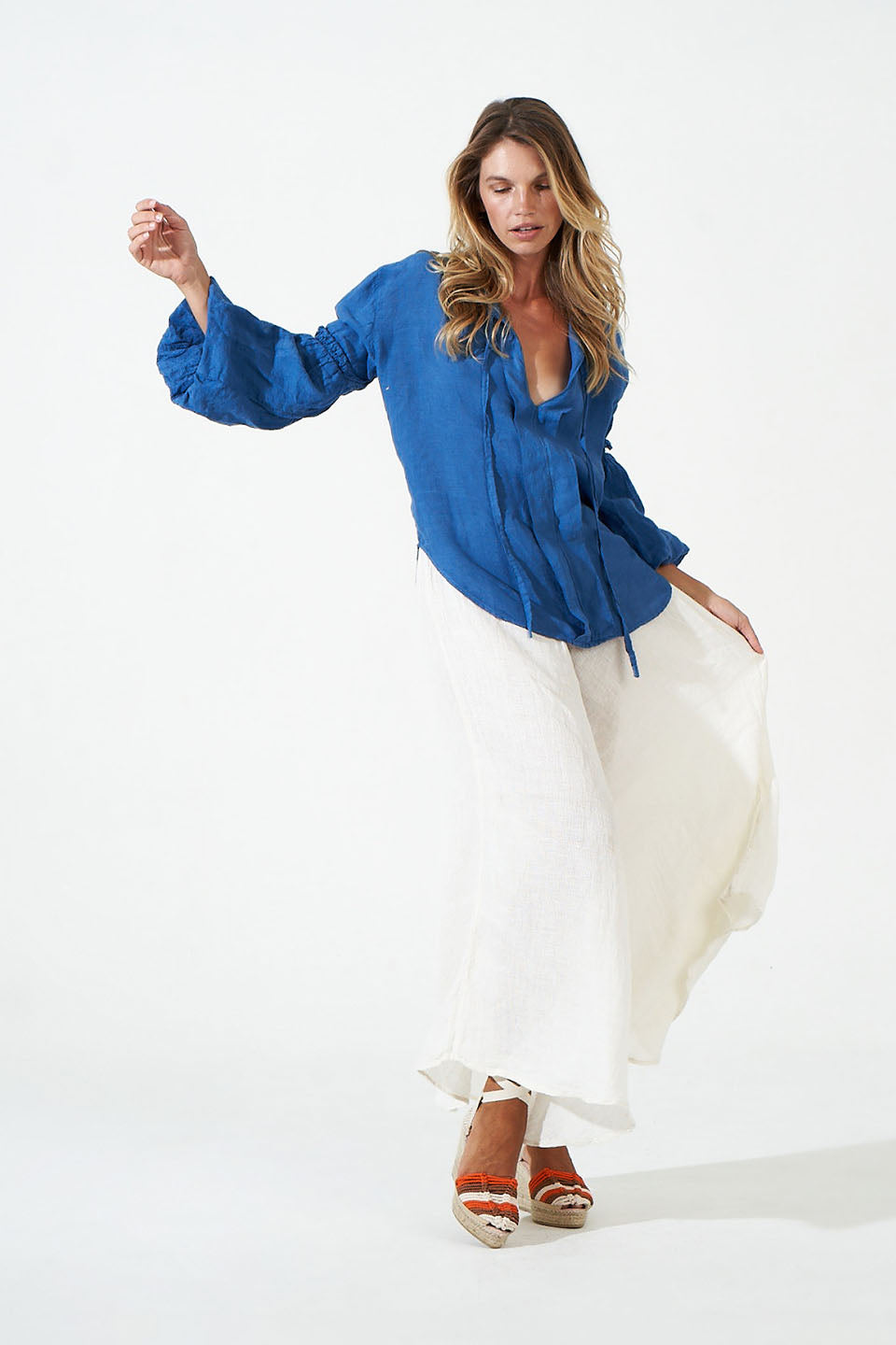 A folksy blouse, the Hemingway Top is designed with a flattering v-neckline, feminine ruffle detail and blouson sleeves for extra volume. Elastic cuffs feature so that it can be worn both long and 3/4 in the sleeve. The Hemingway Top has delicate ties that can be knotted into a chic bow or left undone for a more relaxed feel. A subtle pleat down the front gives it a slightly more polished look.