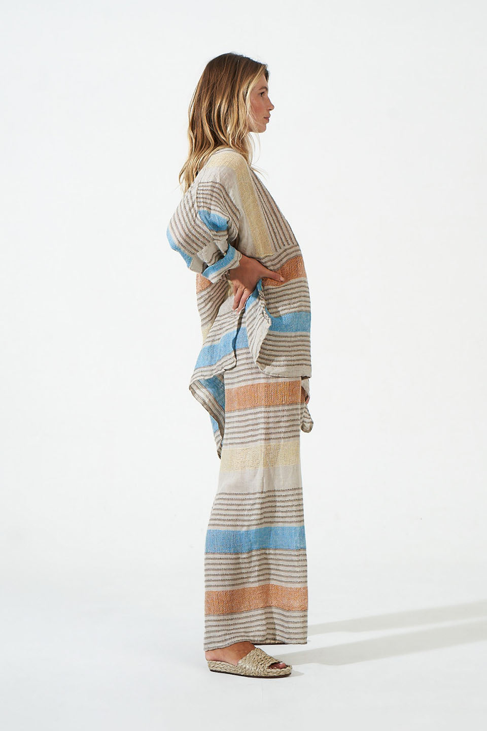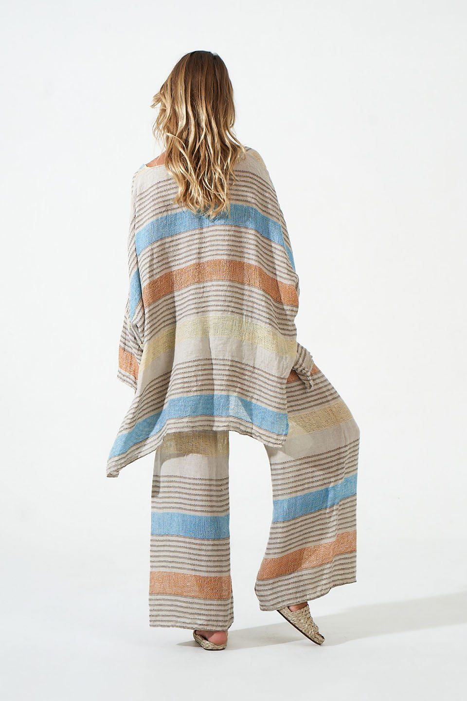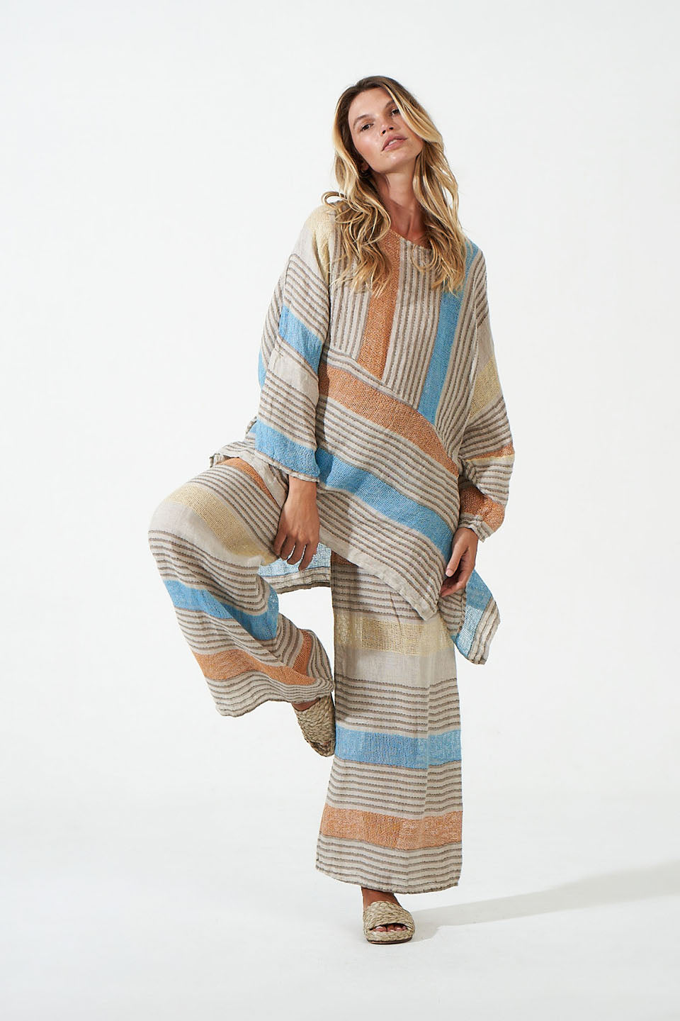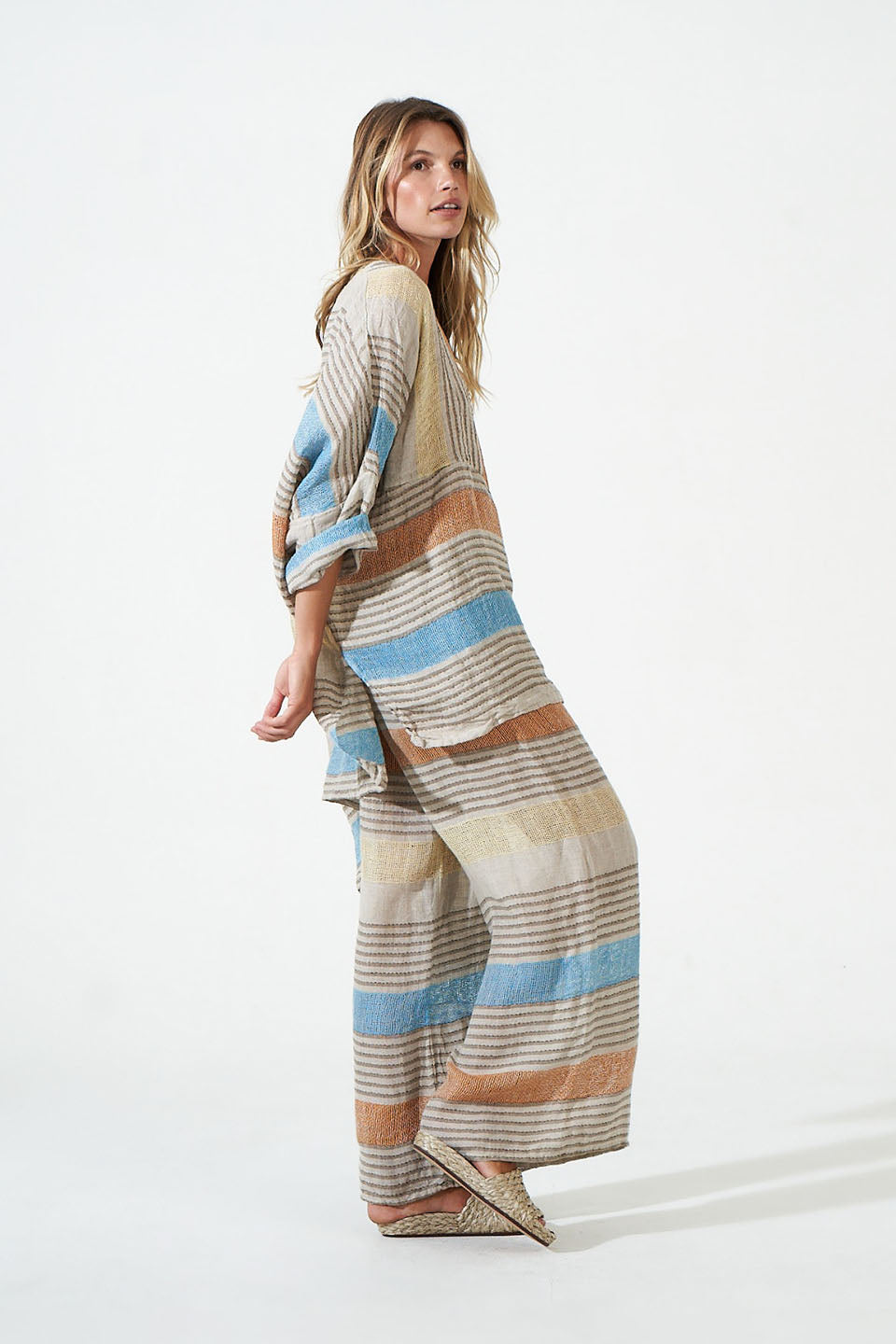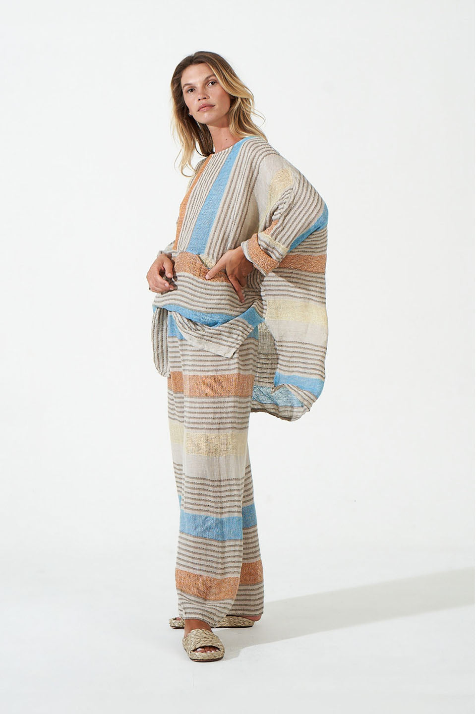 100% Linen, exclusively made in Positano for Estilo Emporio. This classic Estilo Emporio has been updated with a fresh new stripe. A beautiful oversized silhouette, with a scoop neckline and loose 3/4 sleeves. The Nerano Top is cut on...Read more
