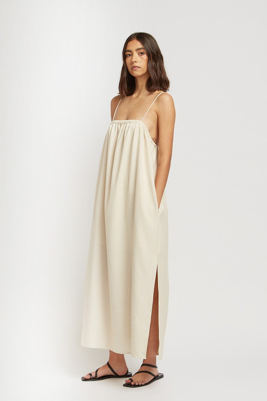 A textured almond cotton blend dress featuring a gathered neckline, low back and rolled straps. Gathered nekline Rolled straps Side splits Side pockets Low back with ties Half lined This garment runs true to size.Garment length: 115cm (size...Read more
