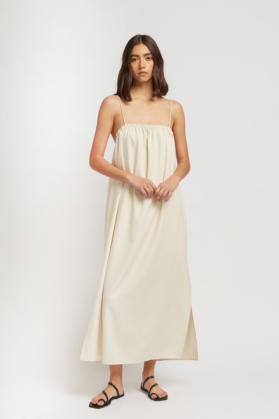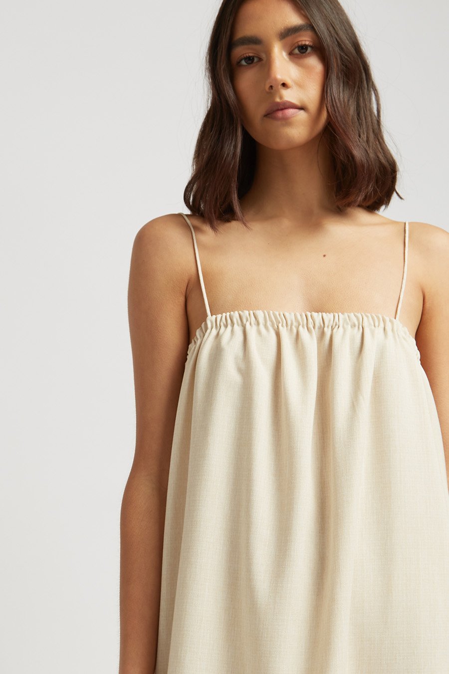 A textured almond cotton blend dress featuring a gathered neckline, low back and rolled straps.