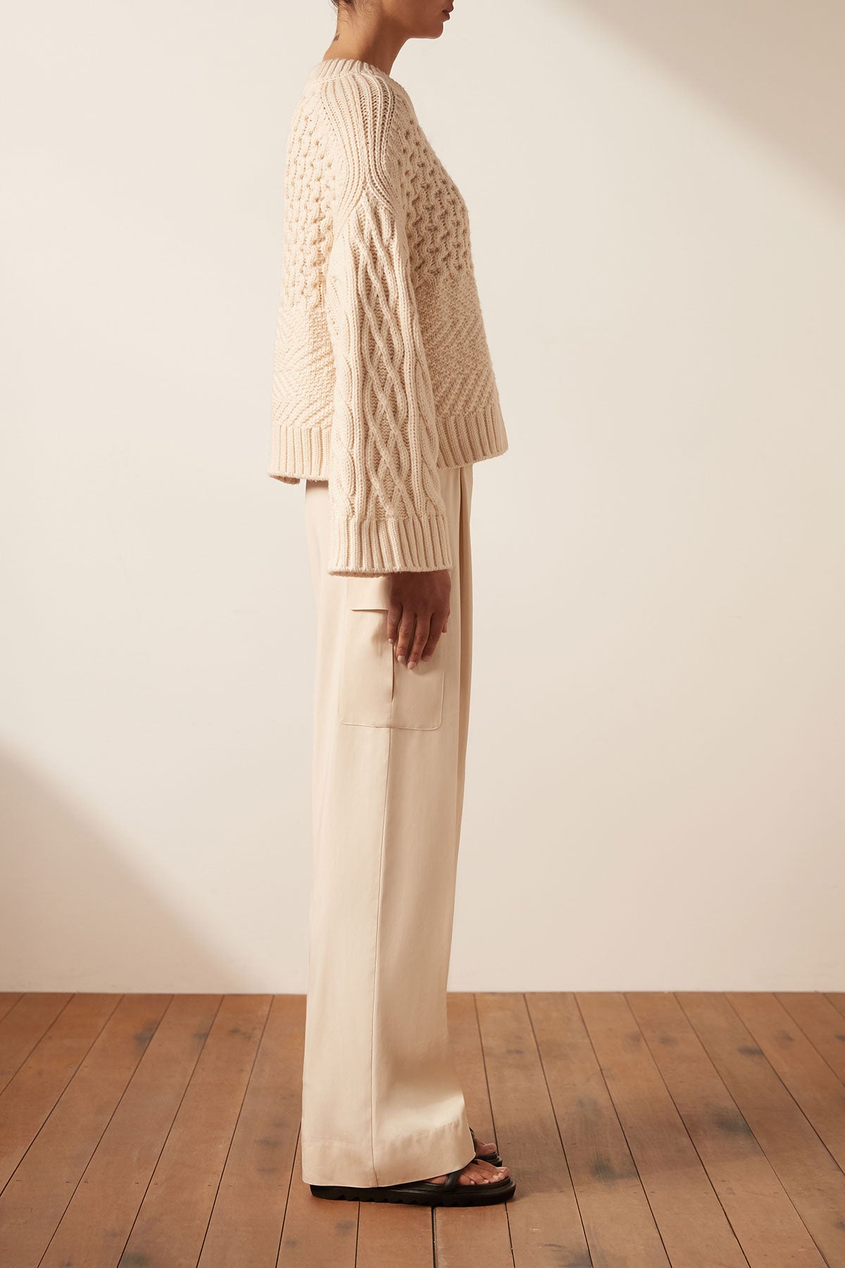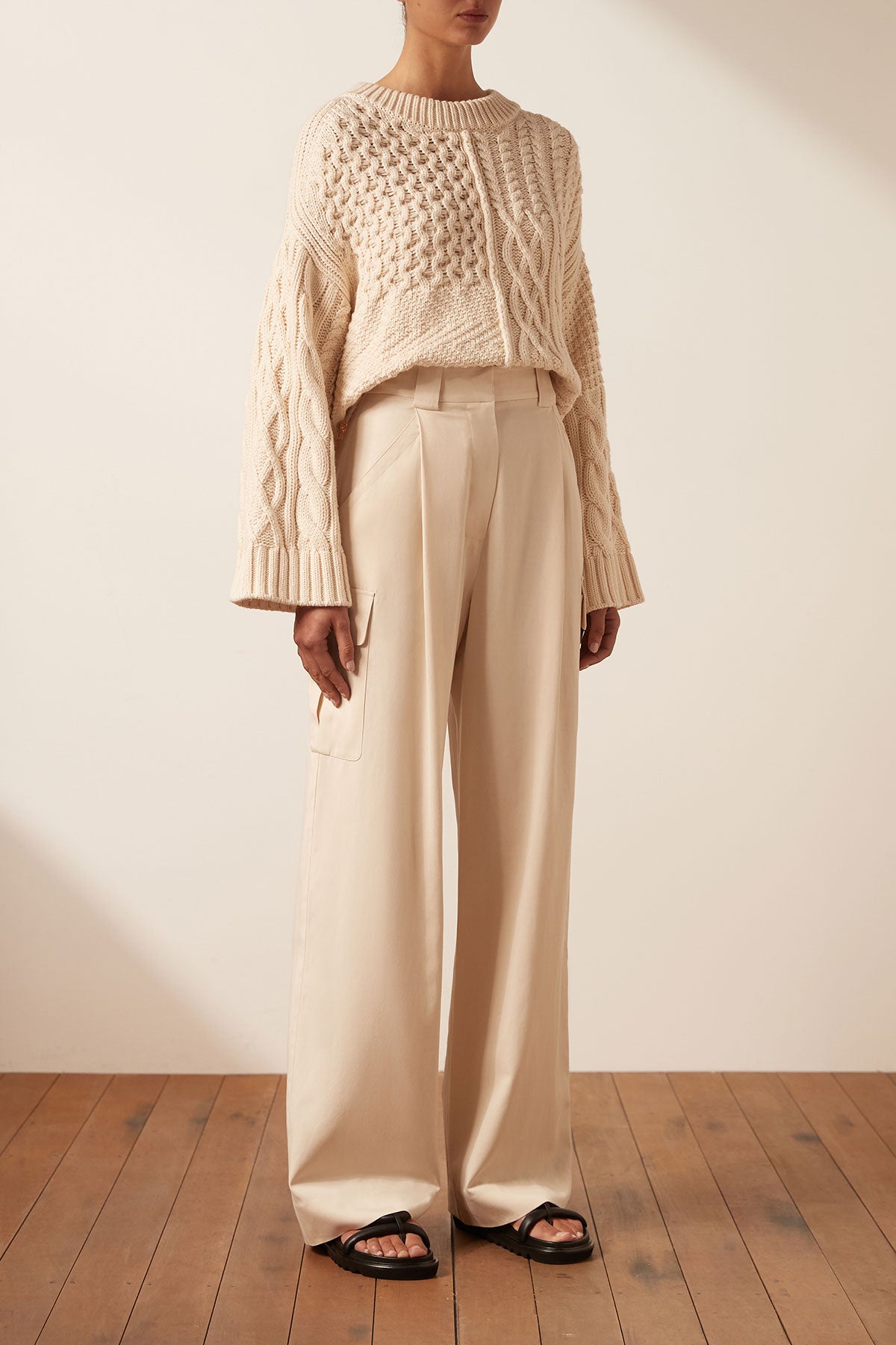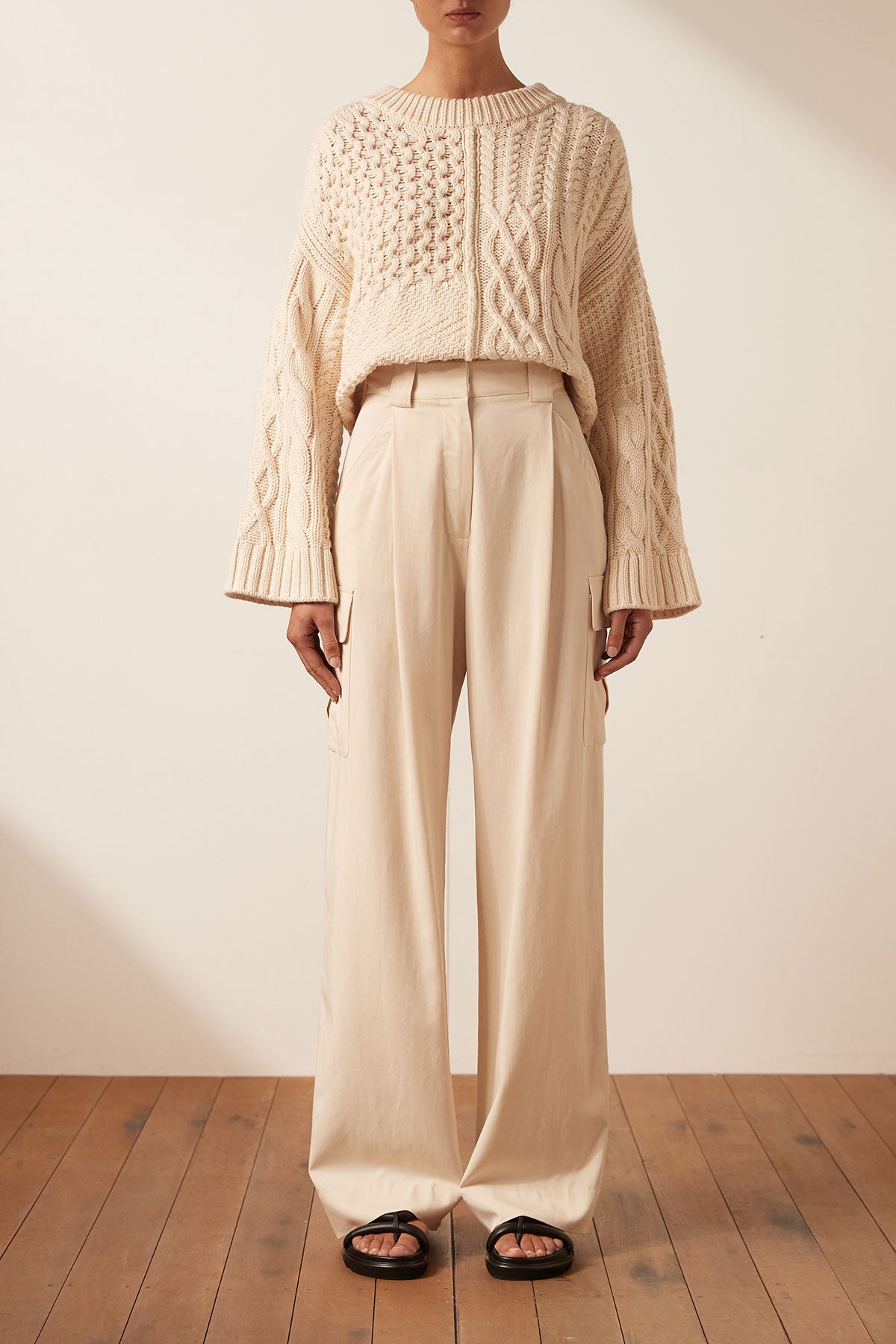 Soft cotton blend knit Cable detailing Round ribbed neckline Dropped shoulders Balloon sleeves Wide hem and sleeve cuffs Relaxed fit Medium weight, stretchy knit 60% Cotton 30% Nylon 10% Wool Designed in Australia Made in China Our studio...Read more