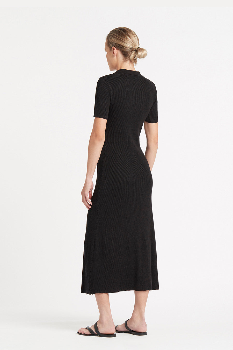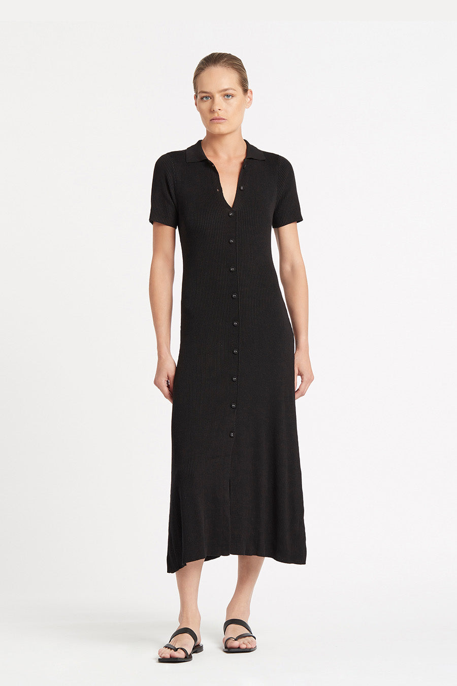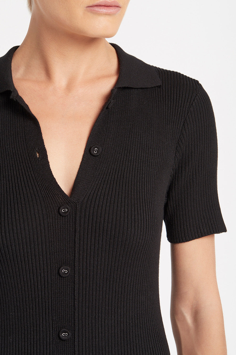 A black buttoned ribbed knit dress with short sleeves and collar.
