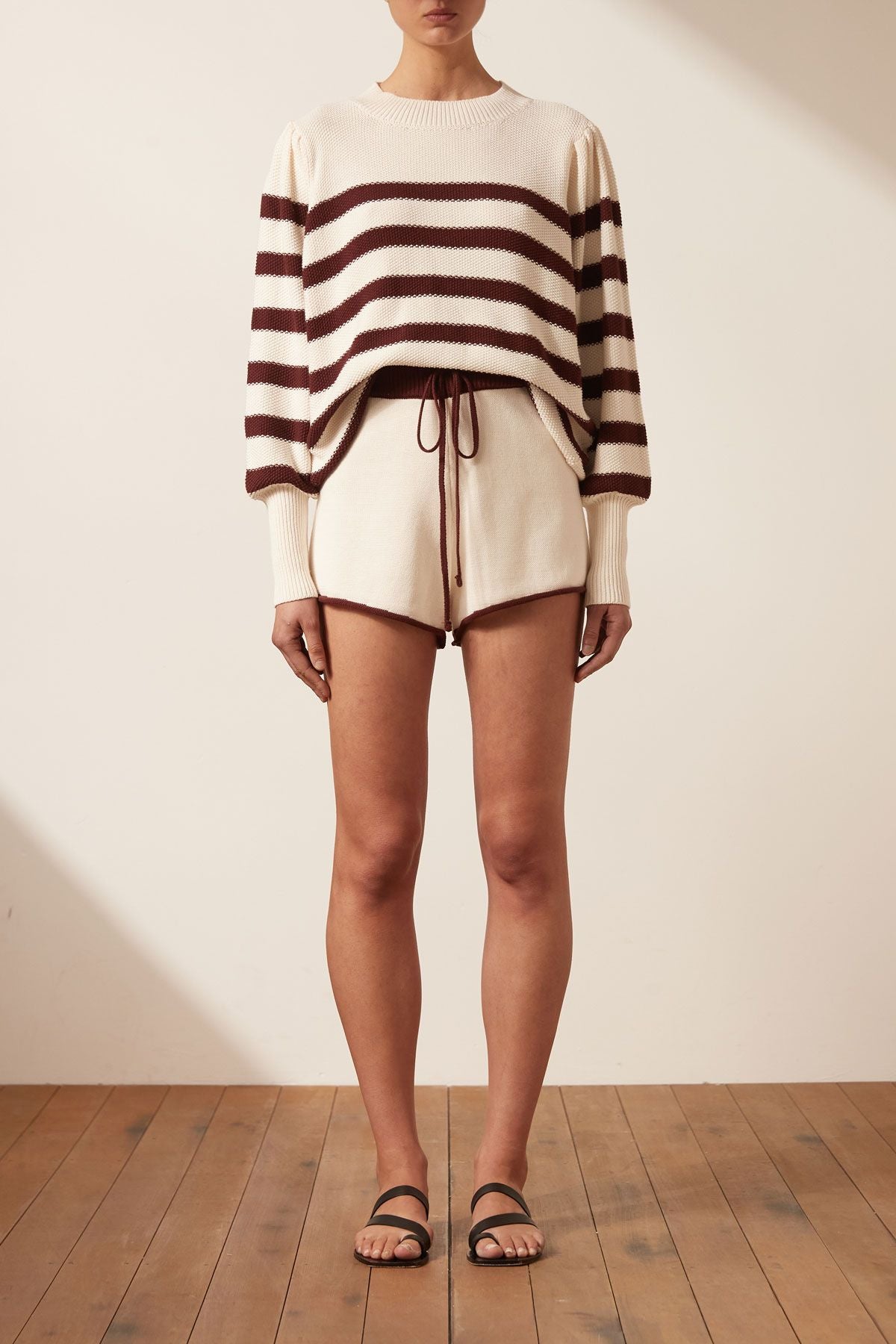 Stripe cotton blend knit jumper with exaggerated cuffs. Relaxed cotton blend knit Crew neck Puff sleeves with exaggerated ribbed cuffs Yarn dyed stripes Ribbed hem 55% Cotton 45% Acrylic Designed in Australia Made in China Our studio model...Read more