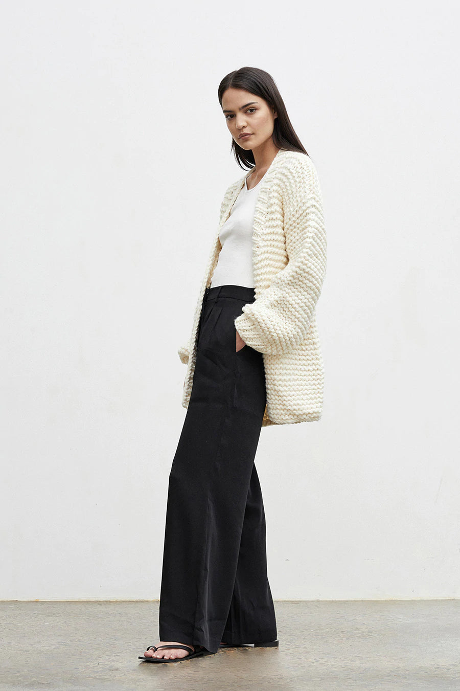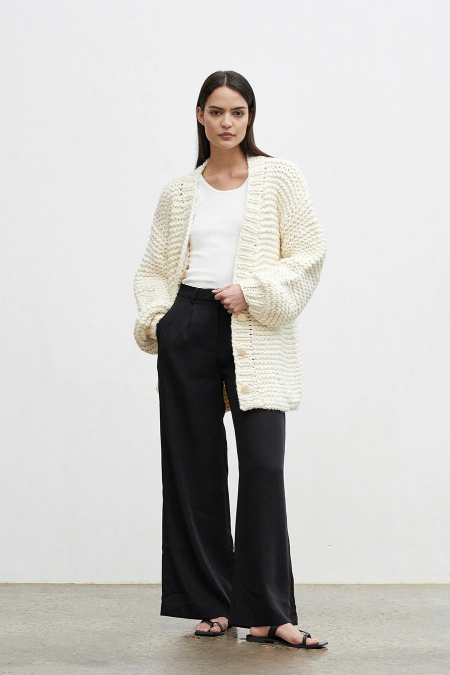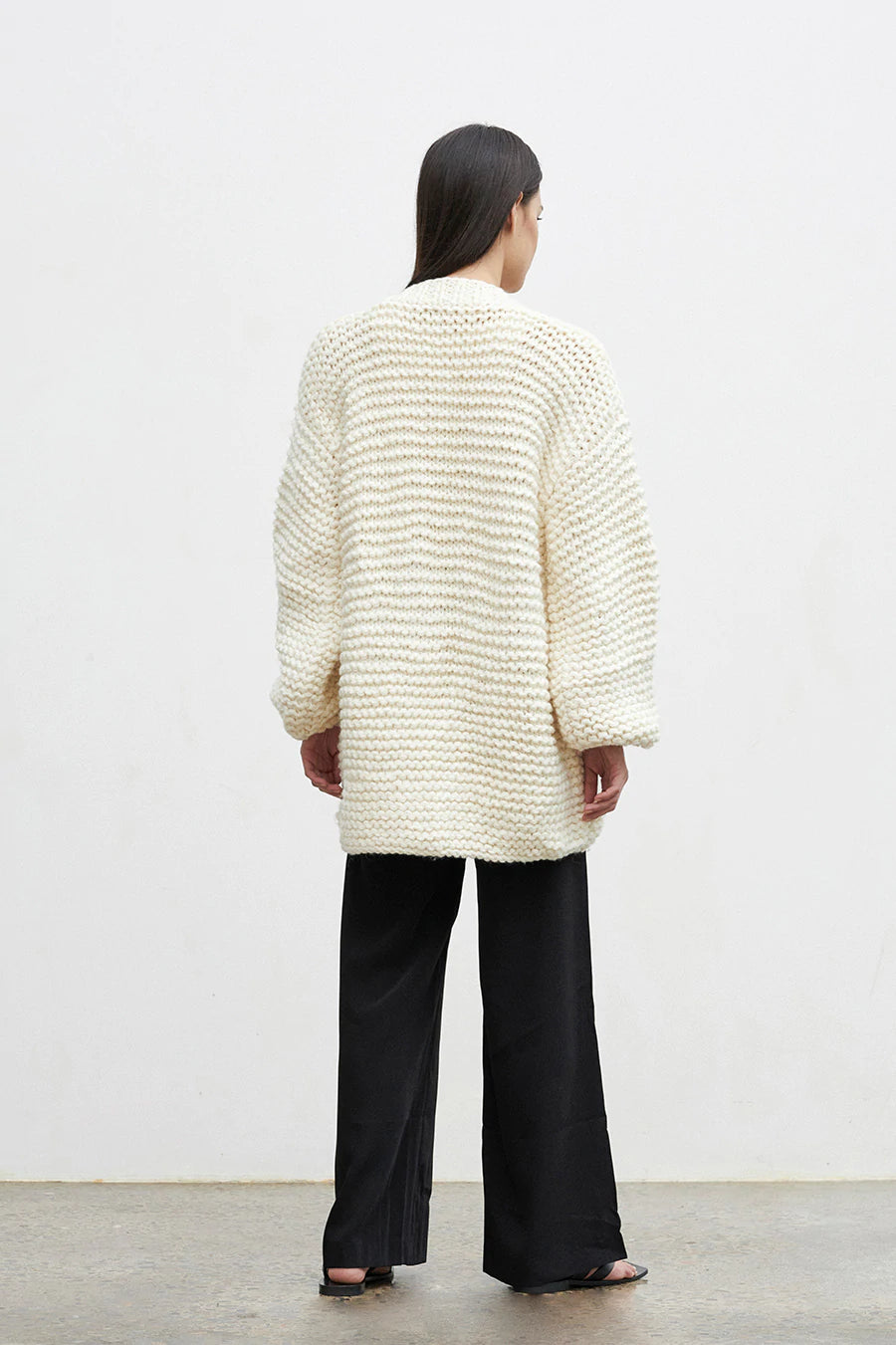 A chunky wool-blend cardigan, slowly knitted by hand, by local artisians. Features oversized sleeves and button closure.