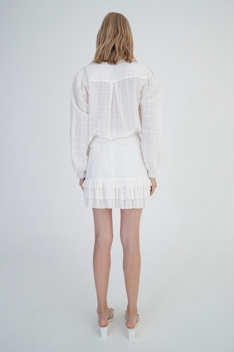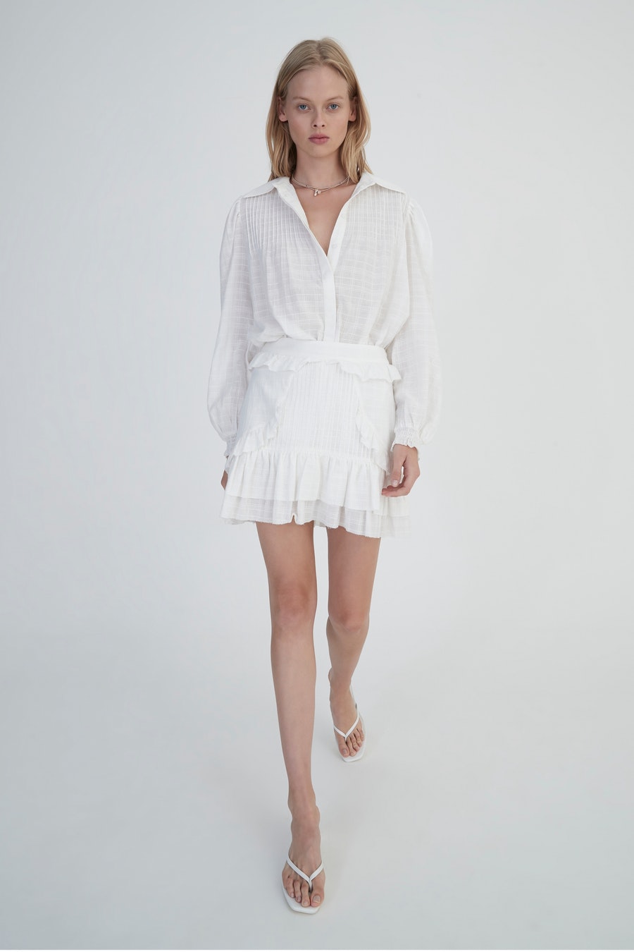 The Iggy Skirt is a mini style skirt with a pintuck detail down the front of the skirt and ruffle details around the waist and shaping the leg. The hem is finished with two ruffles on the hem of the skirt. Model wears a size XS.
