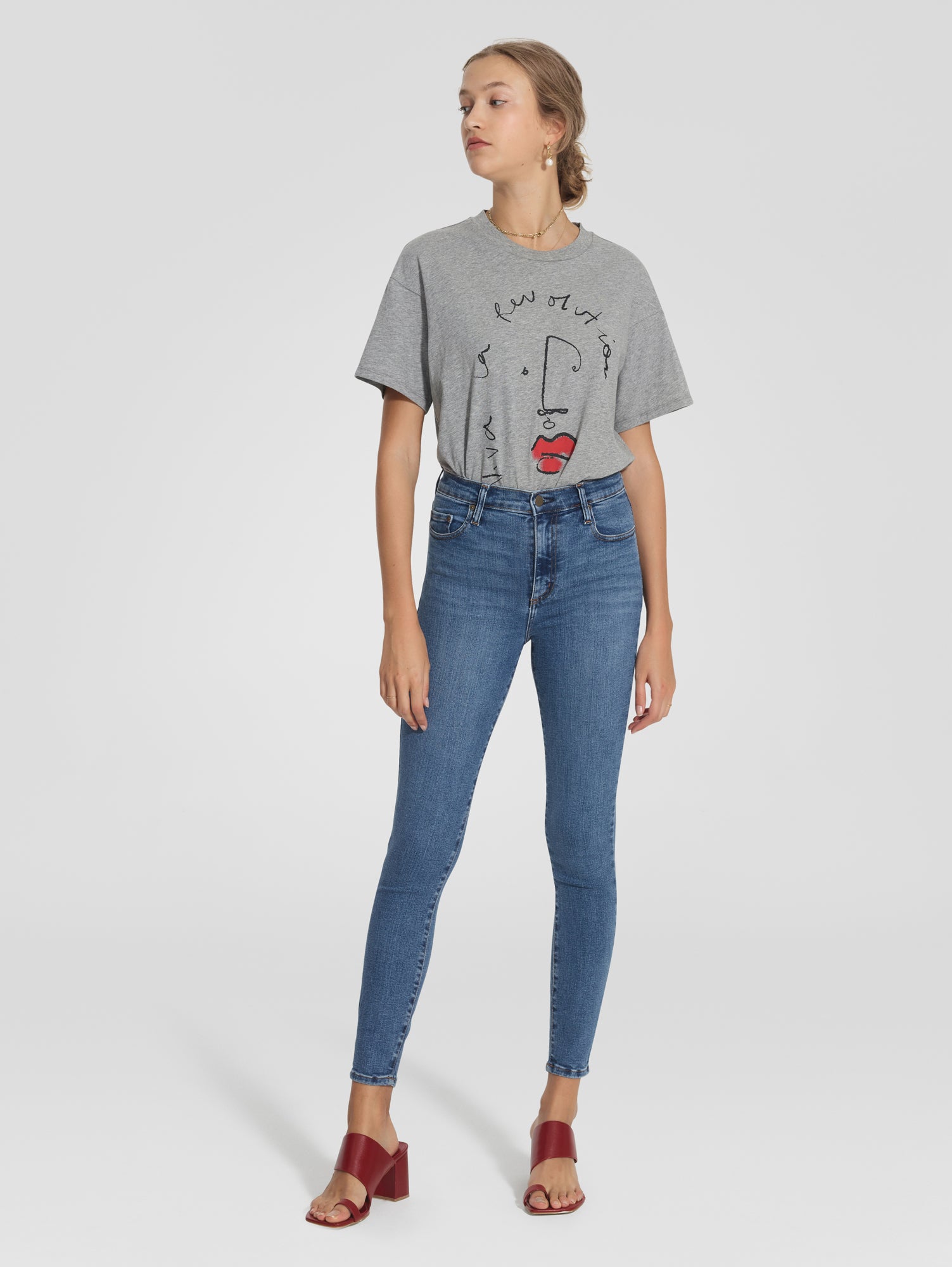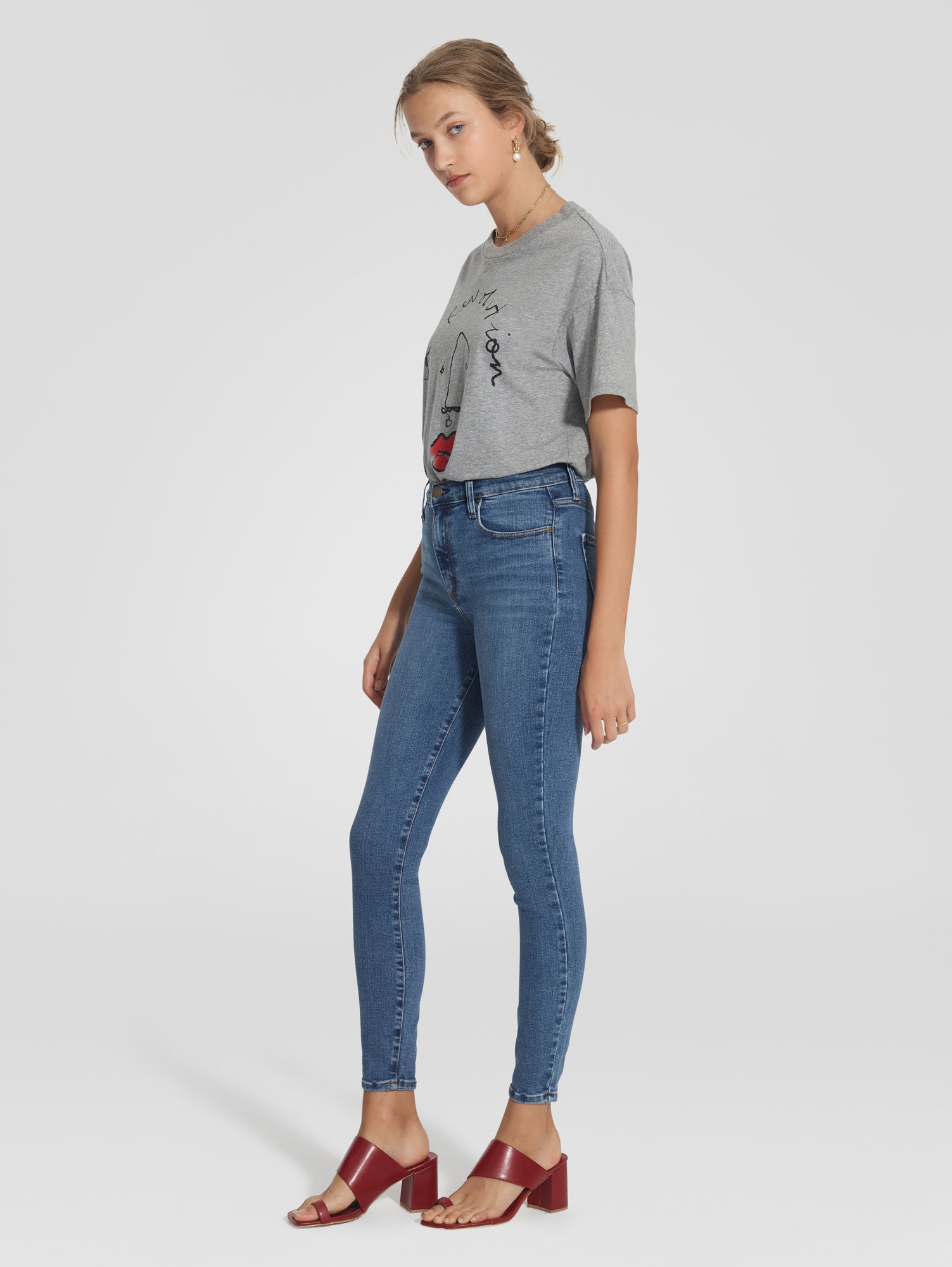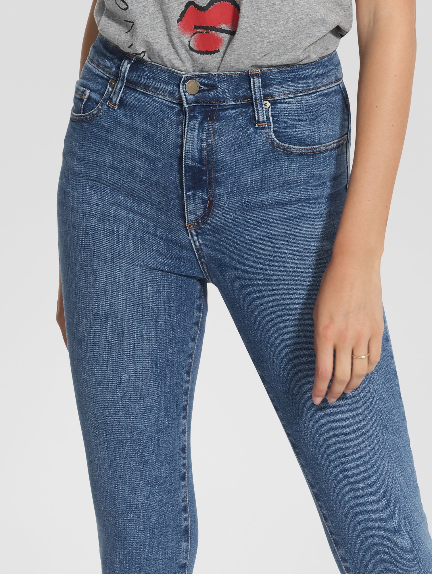 A high rise, skinny leg, ankle crop jean, constructed in bright mid authentic indigo Engineered High Stretch Denim featuring.