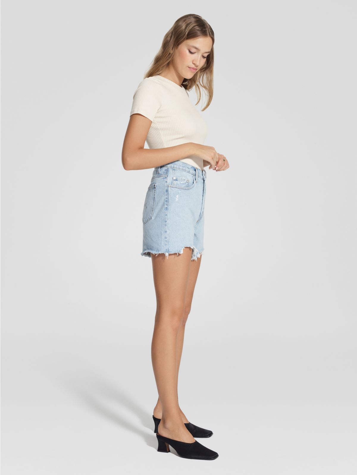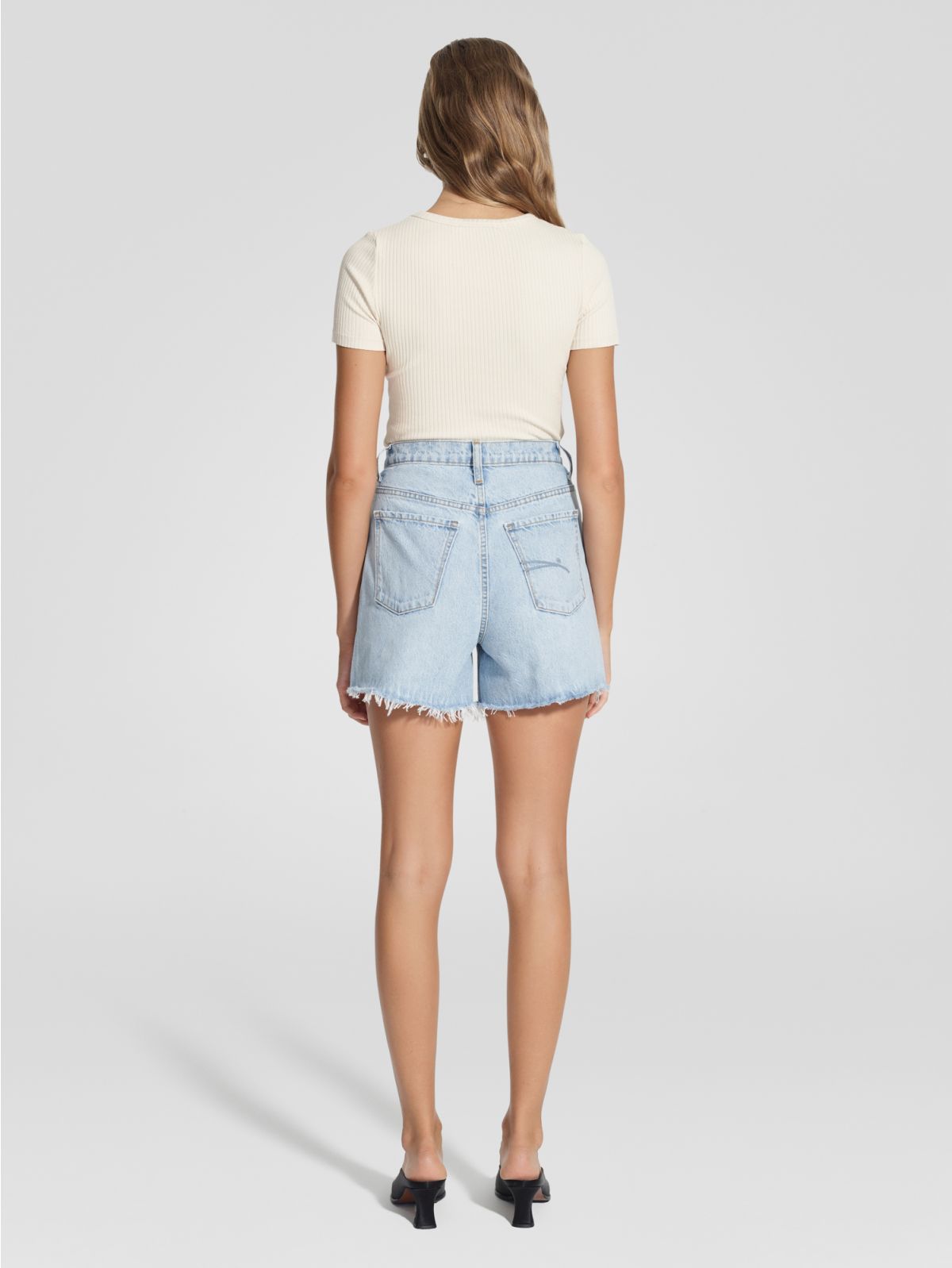 Stevie Short Arty is a Super high rise, Relaxed fit, A-Line Short. An A-line short crafted from Light Authentic Indigo Rigid Denim with Dull Nickel hardware, a raw un-even hem with light worn abrasion at the pockets. An...Read more
