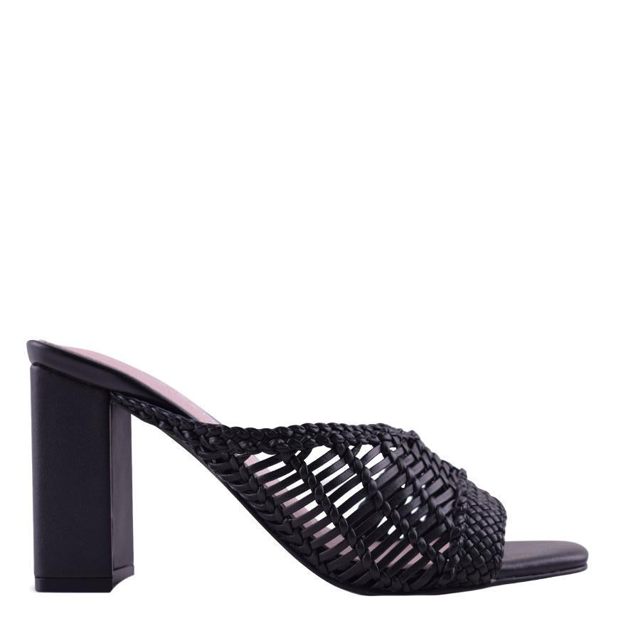 A modern square block heel supports a square toe silhouette in a matte black finish. An intricate asymmetric woven panel wraps around the foot, providing full support and a unique take on the mule trend.